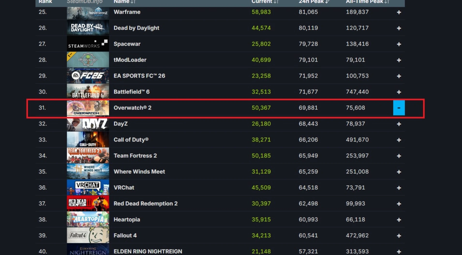 На данный момент пиковая посещаемость Overwatch в Steam превзошла показатели таких проектов, как DayZ и Call of Duty, хотя и уступает Battlefield 6. Тем не менее, в сравнении с шутером от Blizzard Entertainment, последняя игра проигрывает по текущей активности игроков.