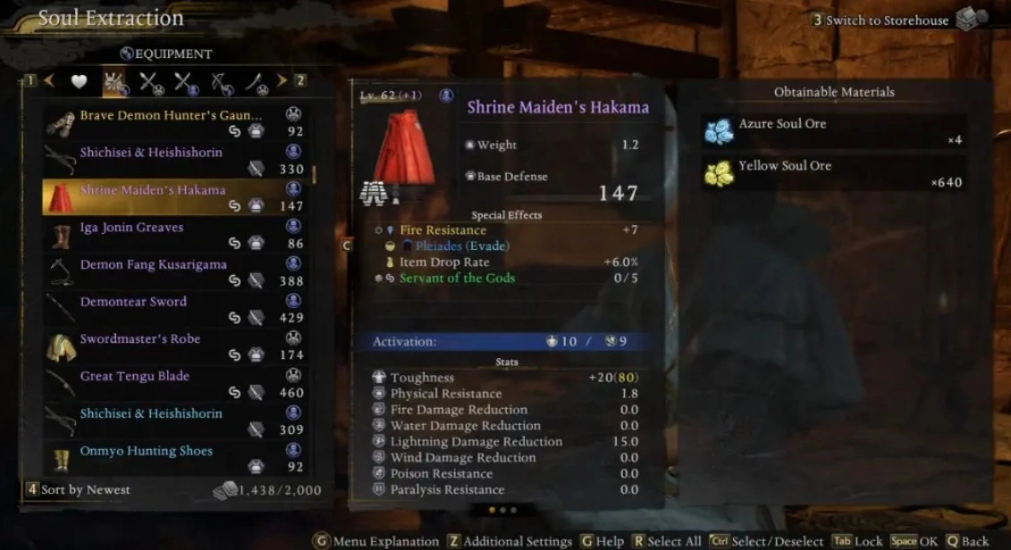 Награды за выполнение квестов: Тщательный анализ списка наград за завершение миссий в ранних главах может принести редкие элементы экипировки, например, "Хакаму жрицы" с бонусом +1, которые послужат отличным материалом для мастерской.