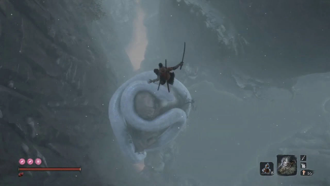 С этим врагом вы встретитесь несколько раз, но окончательно его убить можно, выйдя из «Пещеры опустившейся долины». Просто прыгните на него с горы и нанесите Змею смертельный удар.