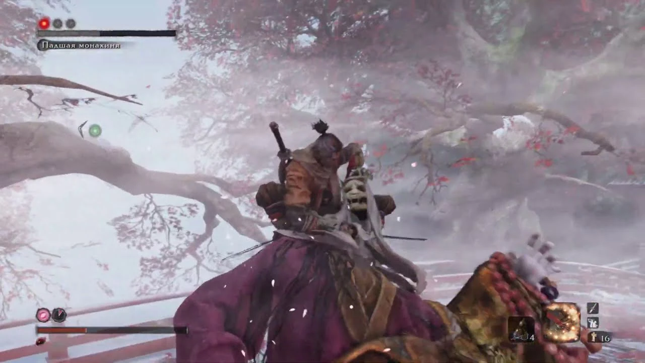Во второй раз Падшая монахиня будет уже гораздо сильнее, чем в первый. Во-первых, у нее теперь три жизни, а во-вторых, она получила много новых типов атак. Однако одолеть ее не так сложно, как может показаться. В первой фазе нарушьте ее концентрацию. Во второй нанесите смертельный удар, спрыгнув на нее с дерева. Когда наступит третья фаза, используйте Петарду синоби.