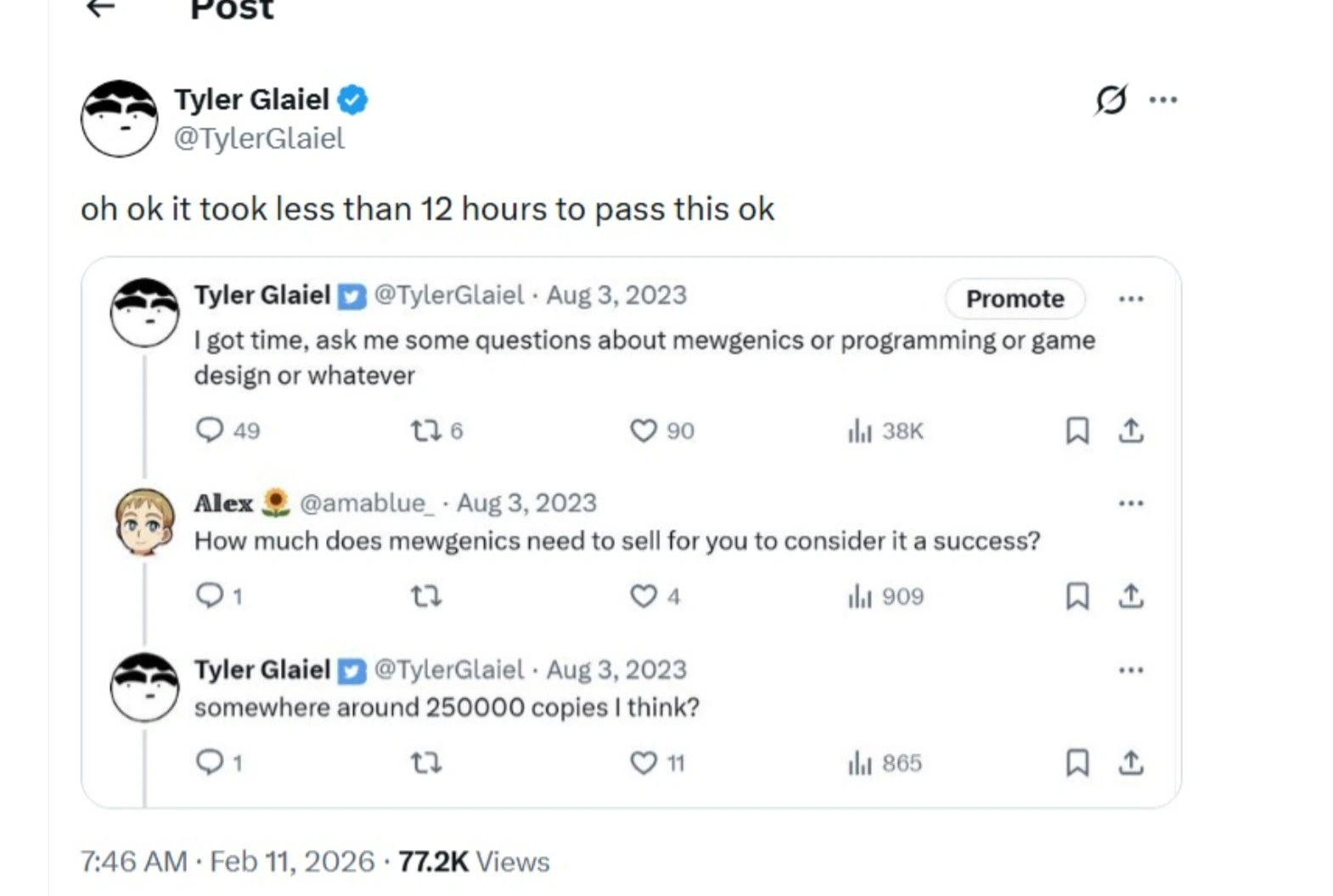 Новая тактическая игра Mewgenics от создателей The Binding of Isaac и The End Is Nigh демонстрирует впечатляющие коммерческие результаты. Уже в первые пять часов после релиза было продано более 150 тысяч копий, а вскоре этот показатель превысил 250 тысяч. Разработка полностью окупила затраты, достигнув планки успеха, которую авторы определили для проекта заранее.