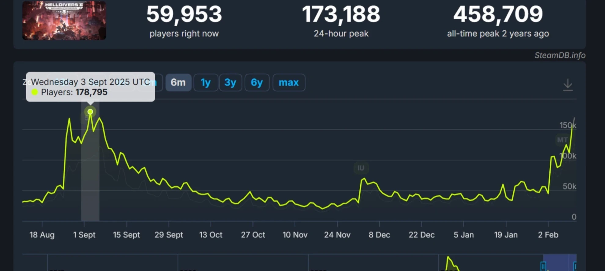 Последний раз свыше 170 тысяч пользователей играло одновременно в сентябре, после выхода крупного обновления «В несправедливость» с мирами-ульями. Однако популярность проекта стабильно росла и в последние месяцы, превысив 100 тысяч игроков в феврале после балансных изменений.