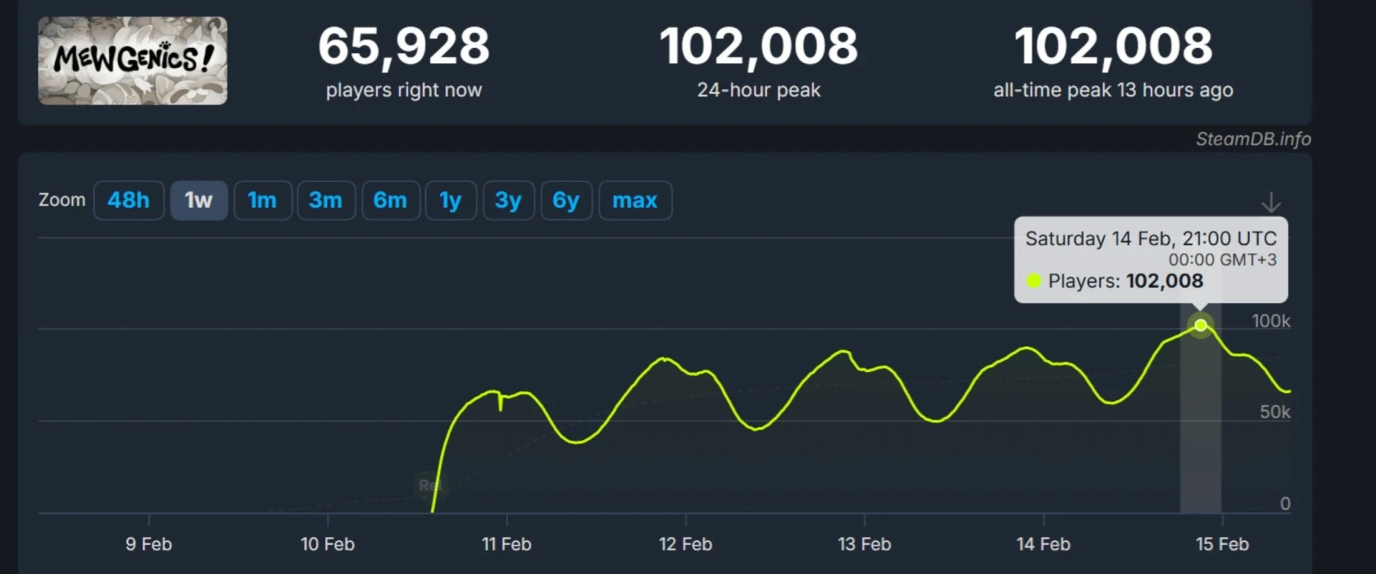 Выходные принесли тактическому рогалику Mewgenics новый рекорд пикового количества игроков в Steam: 14 февраля онлайн превысил 102 тысячи человек. Это лучший показатель для проектов Эдмунда Макмиллена, обогнавший даже пик в 70 тысяч игроков у The Binding of Isaac: Rebirth.