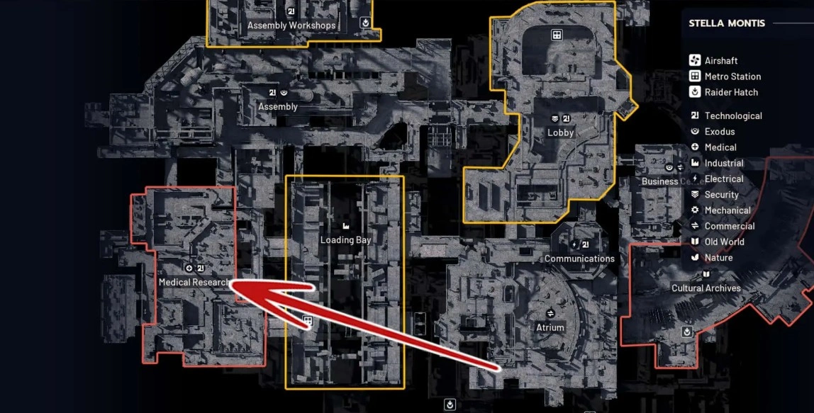 На этой карте единственное место, которое имеет значение, — это Отсек Медицинских Исследований. Найди его на нижнем ярусе, в юго-западном квартале.