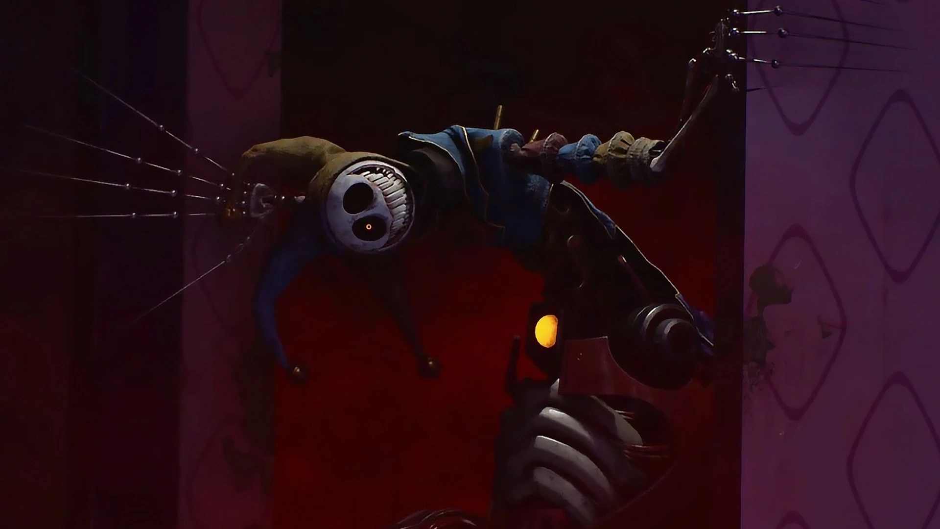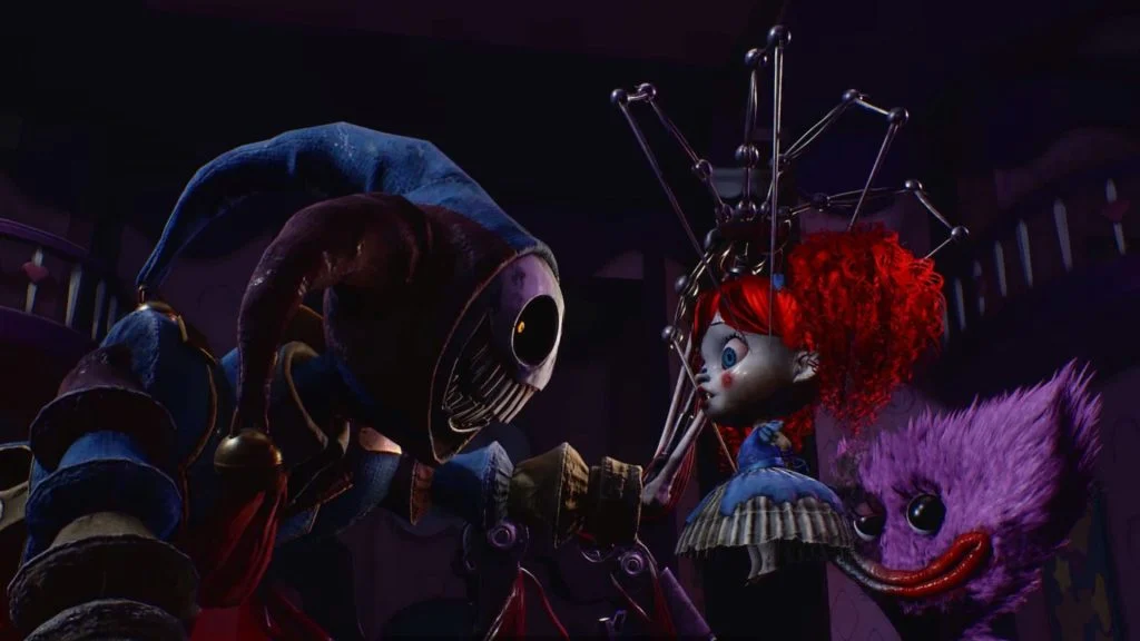Если коротко — это безумный микс механики и плоти, который собирал себя из частей других игрушек. Представьте себе паукообразного робота с человеческими элементами и фарфоровой маской клоуна — примерно так.