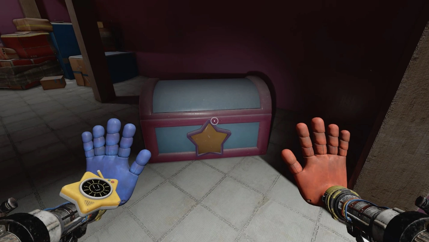 В конце коридора, помимо полки, есть стол с запиской. Если взглянете вверх, то увидите люк, ведущий на чердак. Отодвиньте его любой рукой и подтянитесь к магнитам. Вскоре вы обнаружите сундук. Нажмите на «звезду» на нем, чтобы открыть и заполучить аудиокассету «Заслуженная кончина».