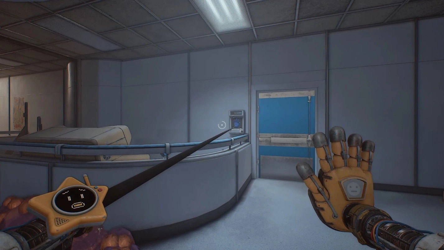 Когда подойдете к Брону и вернете хвататель, переместите контейнер под потолком. Снова поднимитесь и, используя контейнер, перейдите в комнату с новой рукой. Чтобы ее получить, отодвиньте доску — за ней будет код. Введите его на панели и заберите из шкафчика руку-давилку.