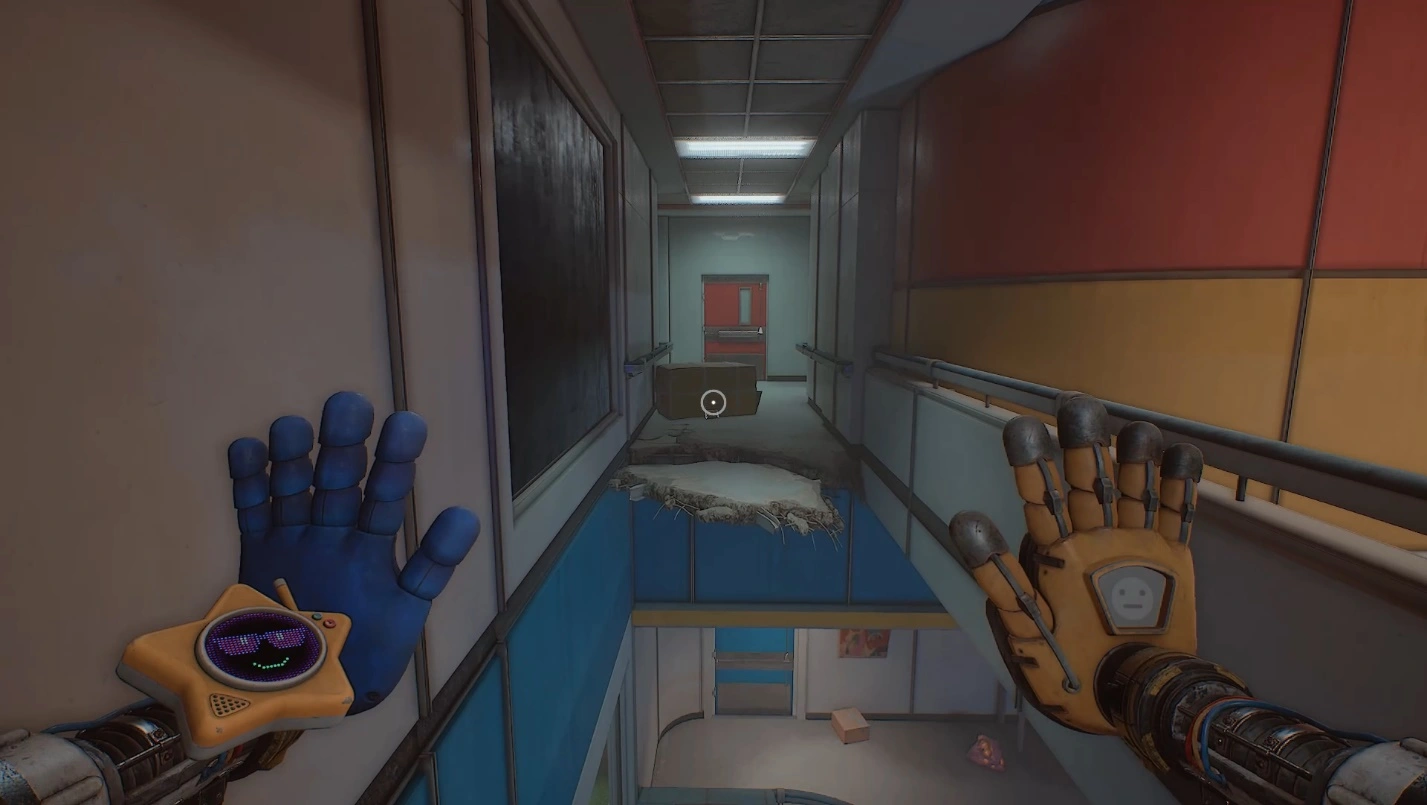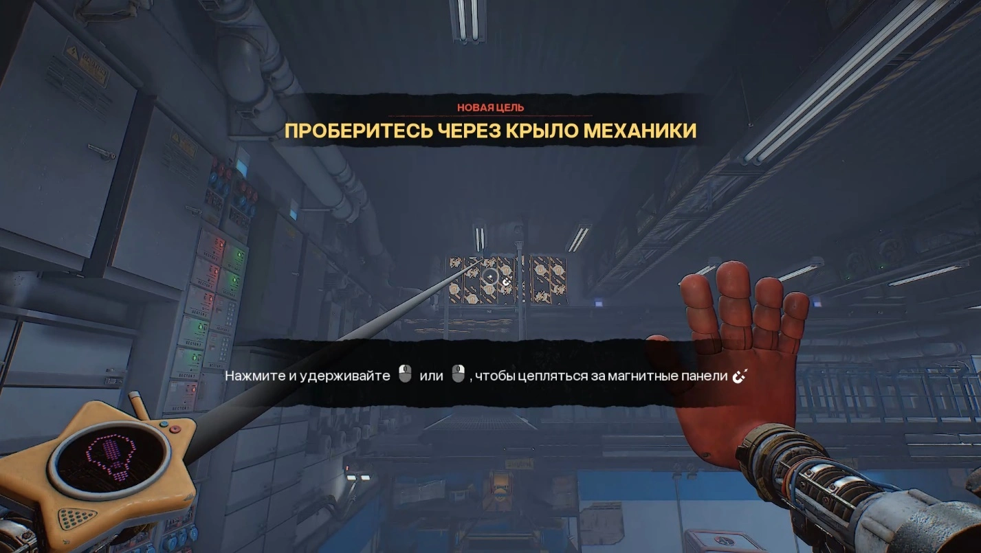 Продолжайте движение, пройдя через две шахты. Придется подниматься, цепляясь за поручни. В первой шахте ухватитесь за верхний поручень синей рукой, затем используйте руку-давилку на зеленой кнопке, чтобы открыть дверь. Тут же переключитесь на красную руку и притянитесь к поручню за быстро закрывающейся дверью.