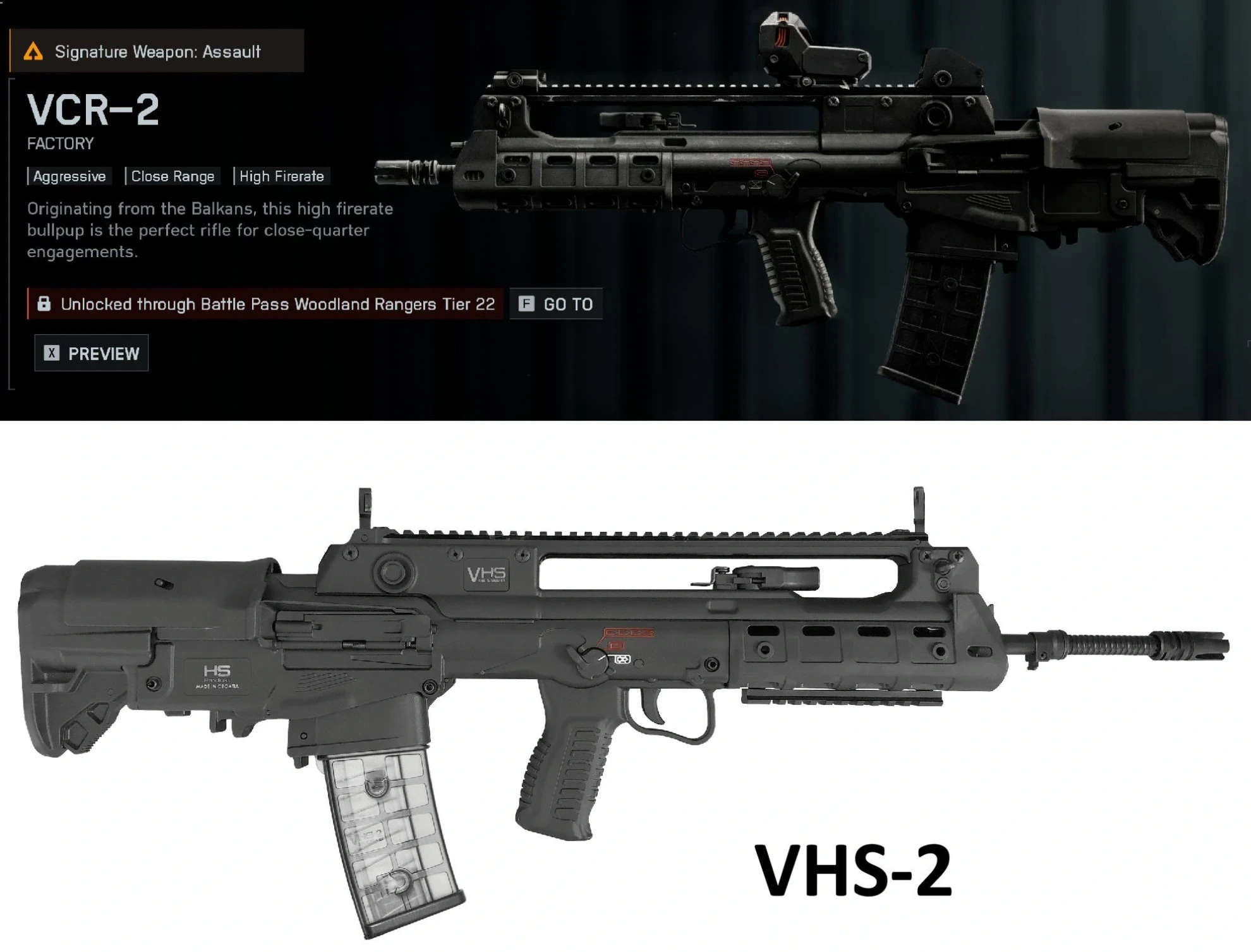 Штурмовая винтовка VHS-2, реальный хорватский прототип, в игре была переименована в VCR-2. Это название является отсылкой к формату видеокассет VCR (Video Cassette Recording), что вызвало позитивную реакцию игроков, которые начали предлагать свои идеи для подобных "шуточных" названий оружия.