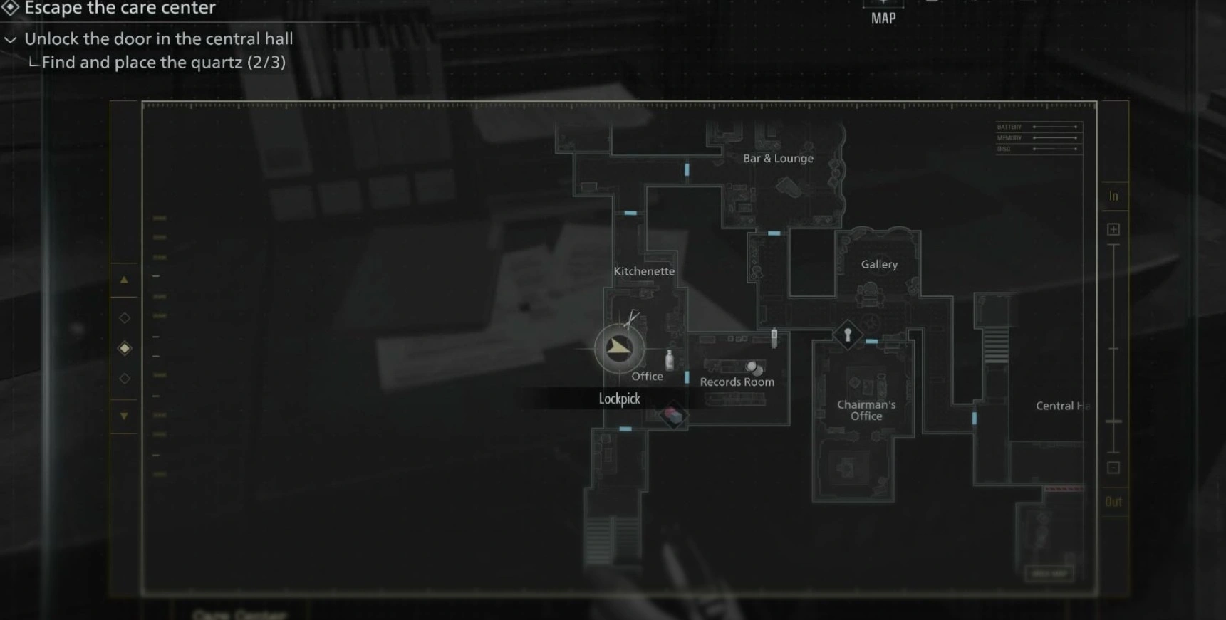 Скриншот демонстрирует место, где мы обнаружили эту информацию. Обратите внимание, что доступ к подсказке сразу получить не получится – придется изрядно побегать по «Центру помощи», собирая необходимые предметы, прежде чем вы сможете добраться до нужного помещения.