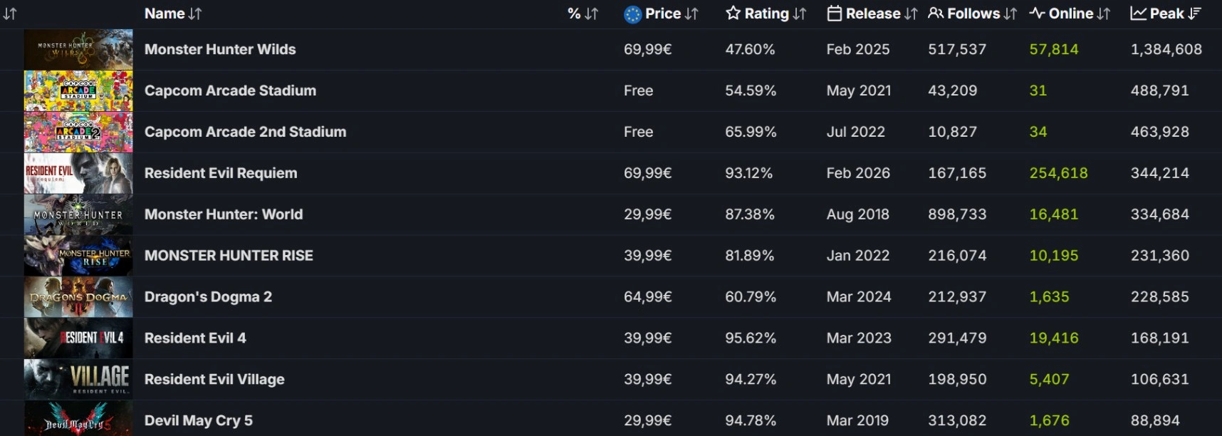 В минувшую субботу хоррор Resident Evil Requiem установил новый пиковый показатель в Steam, достигнув более 344 тысяч одновременных игроков. Таким образом, проект не только укрепил свой успех в серии, но и превзошёл результат Monster Hunter: World (334 тыс.). Однако бесспорным лидером издателя остаётся Monster Hunter Wilds с пиком в 1,3 млн человек в феврале 2025-го.