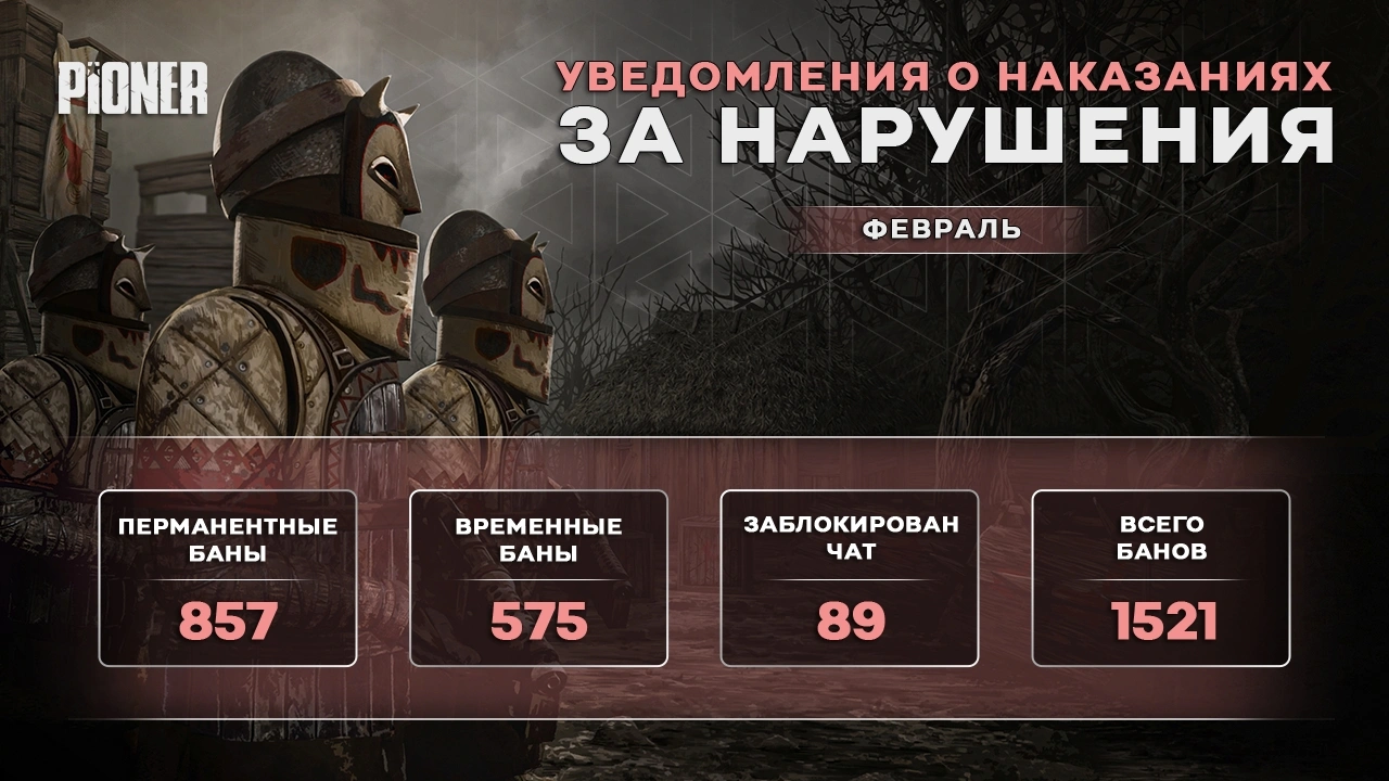 Создатели игры PIONER подвели итоги борьбы с читерами в феврале, назвав этот период более напряженным по сравнению с прошлыми месяцами. Было навсегда заблокировано 857 нарушителей, 575 игроков получили временные баны, а 89 — наказания за спам в чатах.