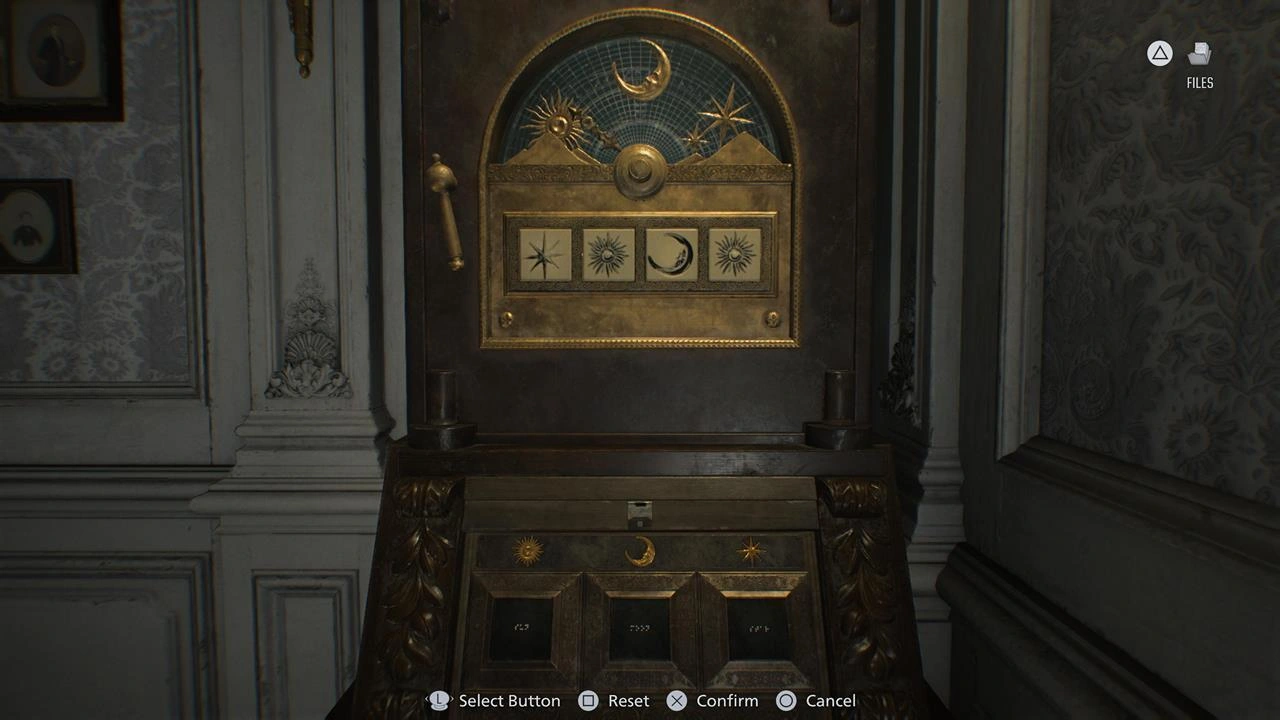 После попадания в центральный зал вы обнаружите дверь с тремя пустыми отверстиями, обозначенными символами Луны, Солнца и Звезды. Как и принято в серии Resident Evil, вам придется разыскать три предмета, которые должны занять эти места.
