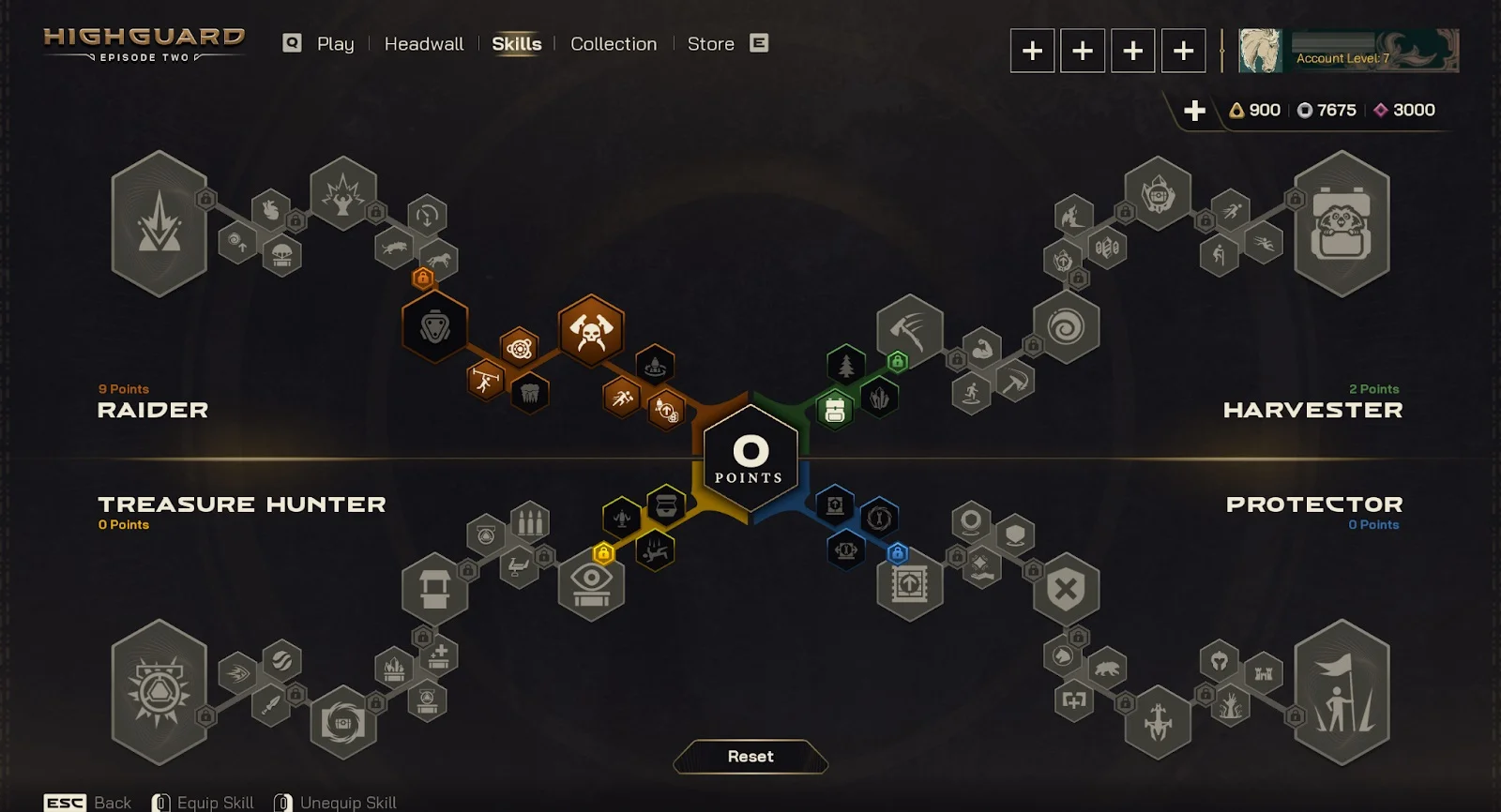 - древо навыков — позволяет развивать персонажа в четырёх стилях (Рейдер, Жнец, Охотник за сокровищами, Защитник) с возможностью сброса очков;