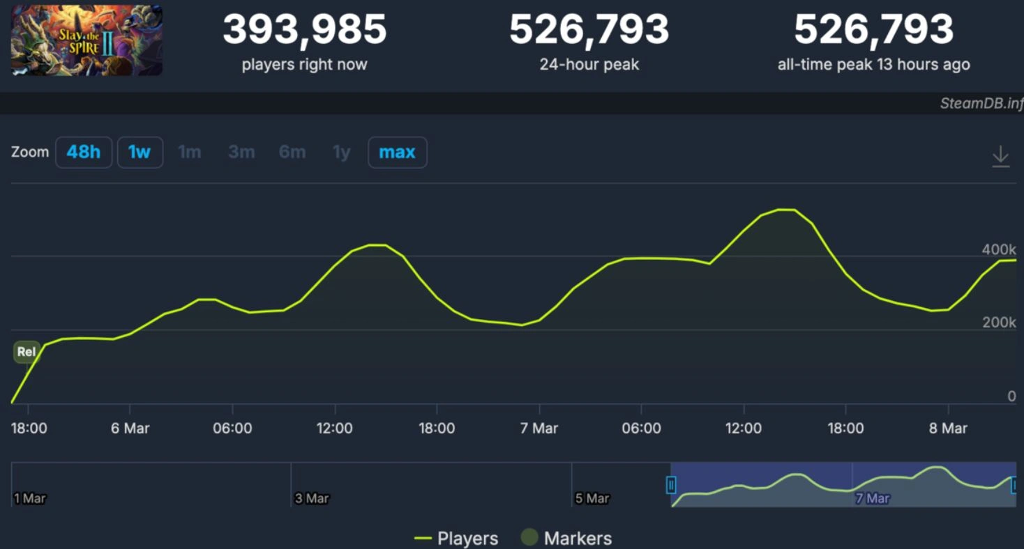 Для сравнения, оригинальная Slay the Spire в своем пике в 2019 году достигла примерно 57 тысяч одновременных игроков. Сейчас же первая часть имеет около 36 тысяч пользователей, в то время как сиквел собрал уже более полумиллиона.