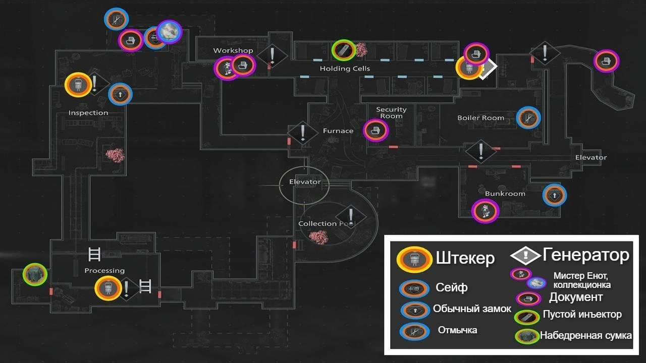 На карте вы найдёте расположение ценных предметов: фигурок Мистера Енота, документов, улучшений для сумки, апгрейдов здоровья и урона, а также отмычек и материалов для крафта.