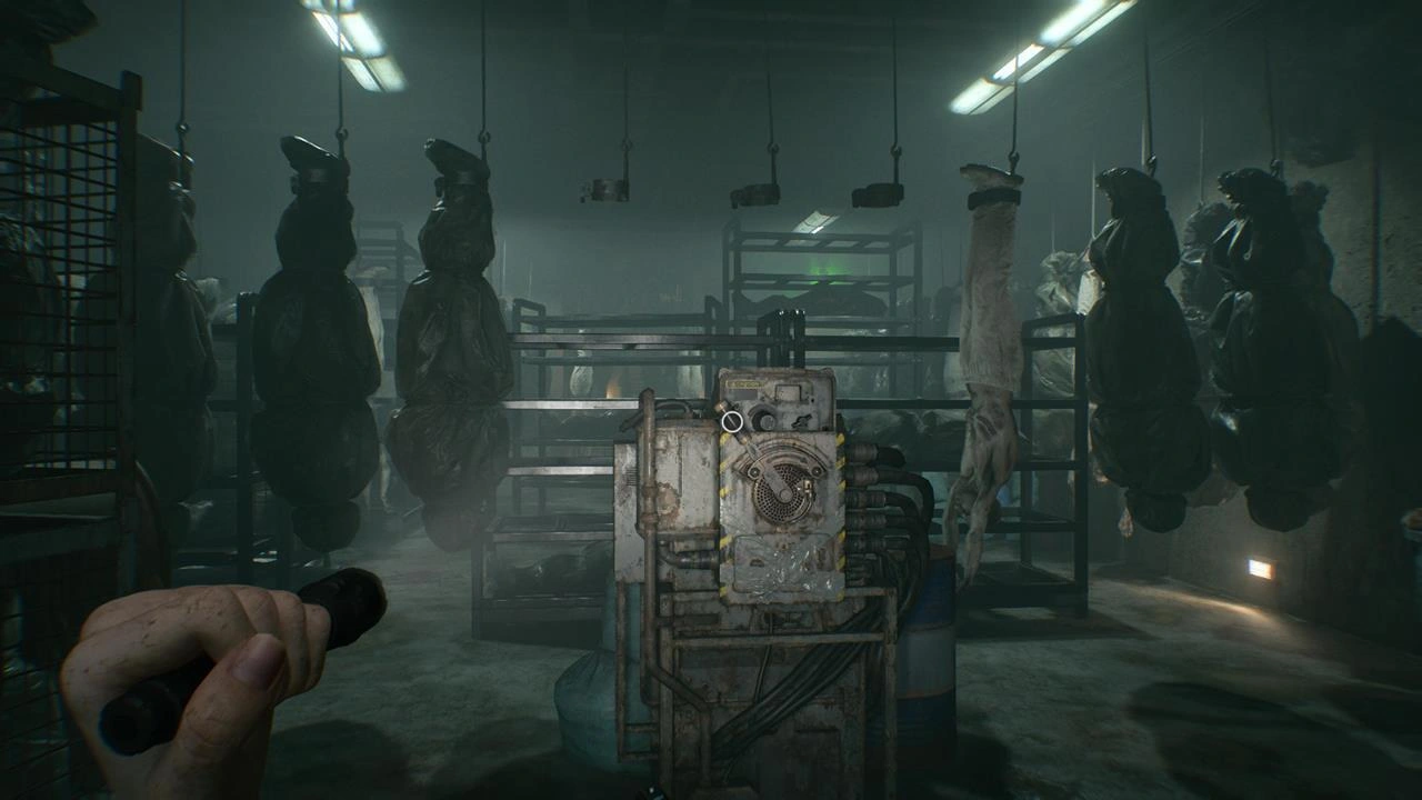 Далее, воспользуйтесь ключом от погрузчика, чтобы попасть в помещение с подвешенными трупами. Там, слева от входа, находится еще один запираемый шкафчик с ценным металлом, требующий вскрытия отмычкой. Пережидая движения висящих тел слева направо, следуйте вдоль правой стены к центру комнаты. Несмотря на попытки зараженных схватить Грейс, это не окажет на нее никакого влияния.
