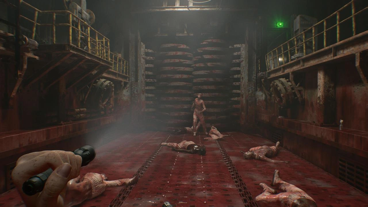 Когда будете готовы, опустошите резервуар и спускайтесь вниз. Неподдающаяся контролю мясорубка, расположенная напротив, представляет серьезную опасность, поэтому держитесь от нее подальше. Отражайте атаки оживающих зараженных, оглушая их и сталкивая к вращающимся лезвиям. После завершения схватки поднимитесь по лестнице, чтобы забрать третий, финальный соединительный штекер.