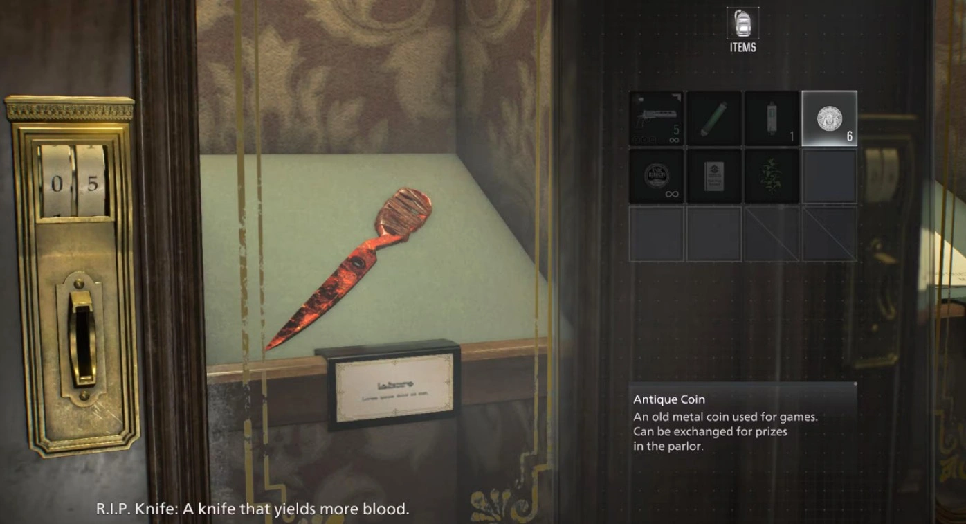 Исследуя медицинский центр Роудс-Хилл в роли Грейс и достигнув гостиной, вы вновь увидите кабинет, где награды выдаются за древние монеты. На «Безумии» ассортимент в этом месте отличается от предыдущих прохождений. Среди возможных трофеев — нож «Убийца», оцененный в пять древних монет.