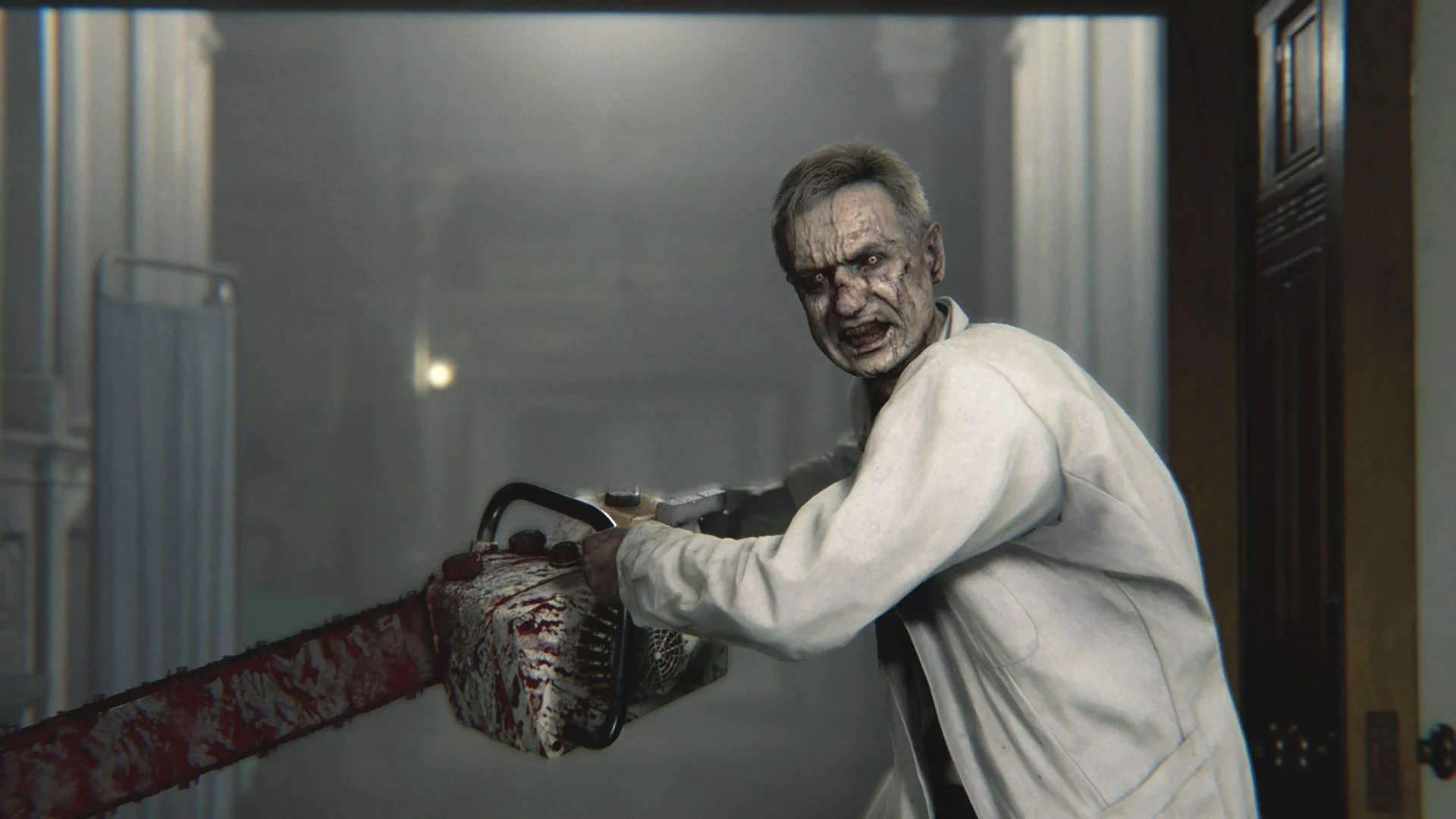 Первый шанс зацепить бензопилу появляется, как только Леон топнет ногой в Родос-Хилл. Там тебя будет вести одна медсестричка, но не ведись на её милый вид! Как только доберётесь до одного из кабинетов, там тебя поджидает настоящий кошмар – зомбак-доктор, который не церемонится и размахивает именно бензопилой.