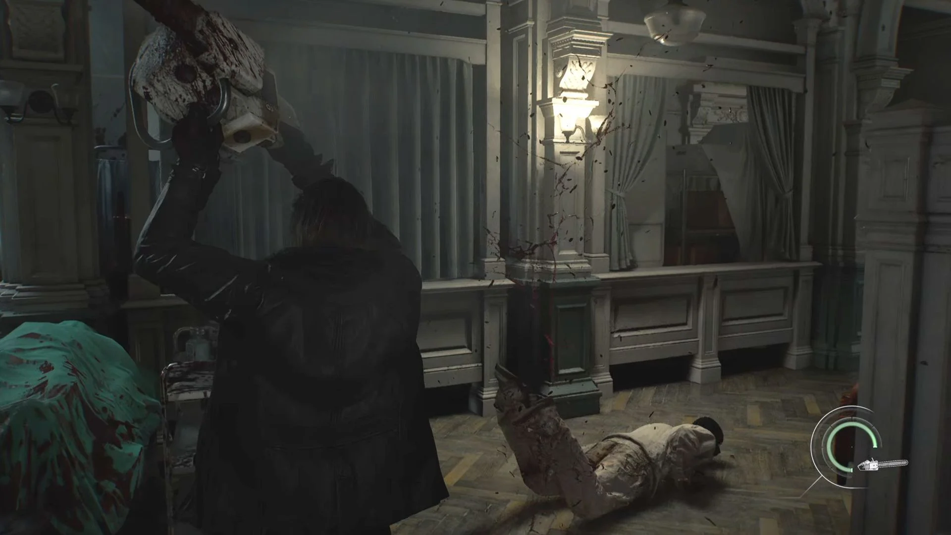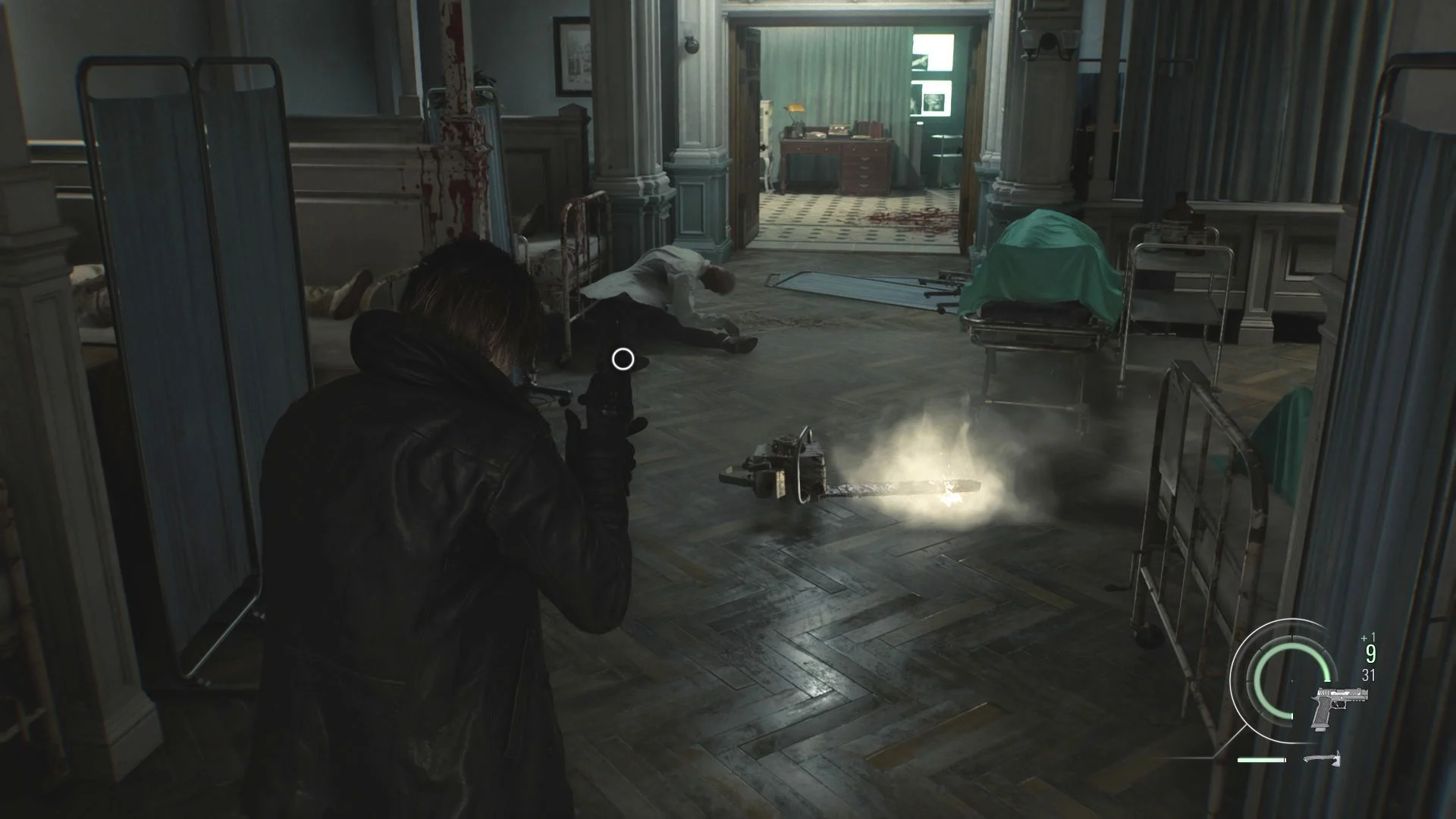 Теперь задача – убрать зомби-доктора, чтобы он уронил свою бензопилу. Стреляй в него, пока он не разжал хватку. Но вот тут самое главное: не спеши поднимать эту адскую машину с пола! Пока она вращается, Леона может зацепить. Подожди, пока пила остановится.