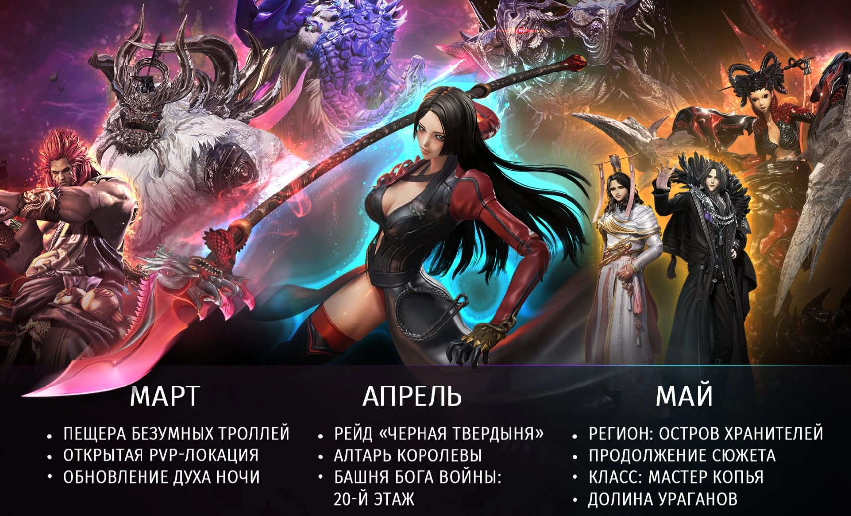 Май завершит весенний цикл открытием региона "Остров Хранителей", который продолжит развитие игровой истории. Главным событием месяца станет ввод нового играбельного класса — Мастера копья.