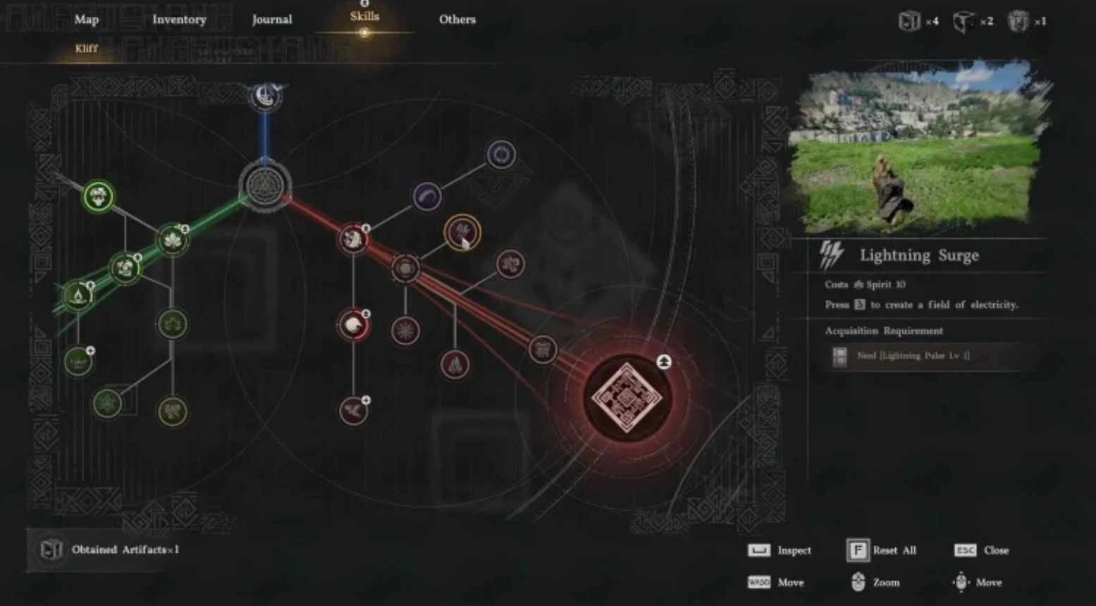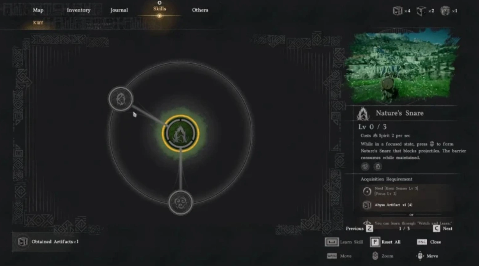 Дерево навыков разбито на три ключевых направления, каждое из которых связано с определенным ресурсом: Выносливость (синий цвет), Дух (зеленый) и Здоровье (красный). Крупные сферы в конце каждой ветки навсегда повышают соответствующий показатель. При этом большинство умений имеют несколько ступеней улучшения, что не только открывает новый прием, но и добавляет ему дополнительные эффекты.