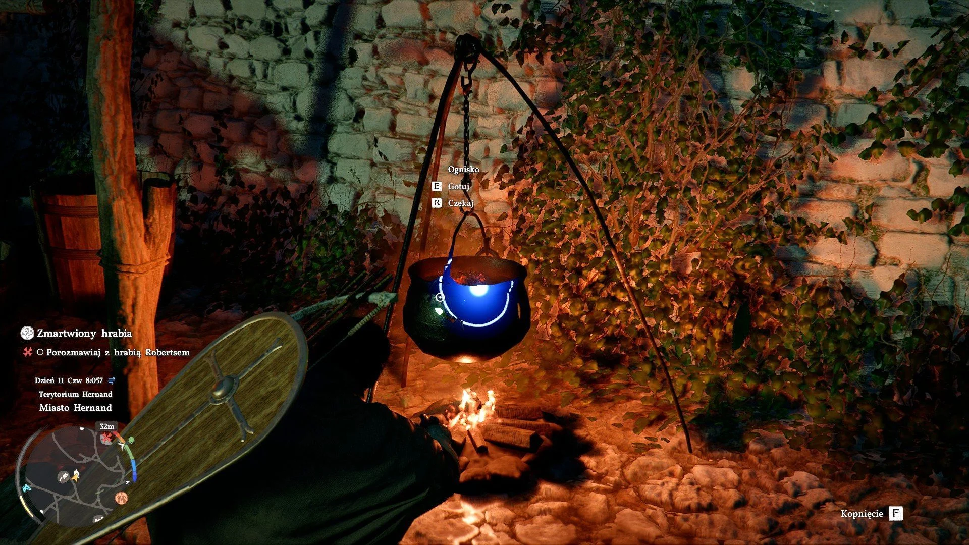 - Ждать у костра — эти места легко найти в деревнях и лагерях (например, в Эрнанд). Там есть кастрюля и к тому же бывает возможность просто «подождать». Чтобы активировать её, удерживай L1/LB или CTRL, и появится опция «Ждать».