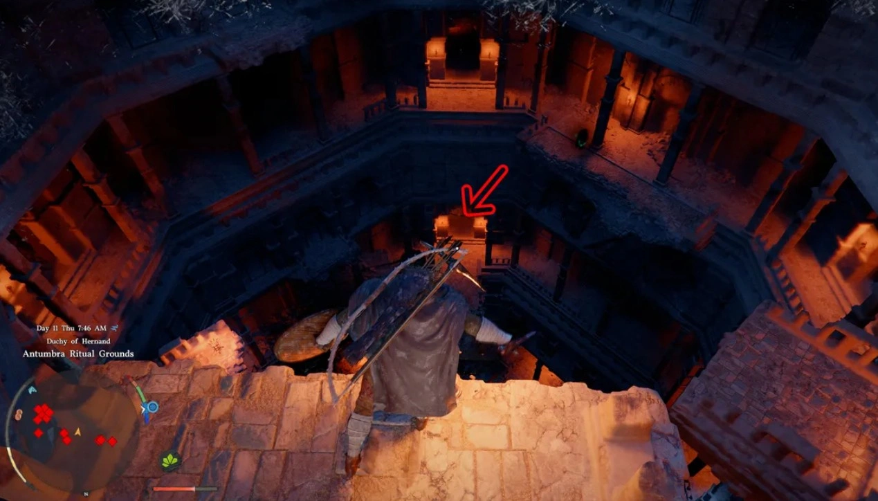 Оружие находится на Ритуальных землях Антумбры. Нужно отыскать пещеру в скале, которая на карте расположена у правого края буквы «Х» в названии города Хернанд. В этом горном регионе царит сильный холод. Мороз пагубно влияет на эффективность расхода выносливости, что стоит учитывать при планировании передвижений.