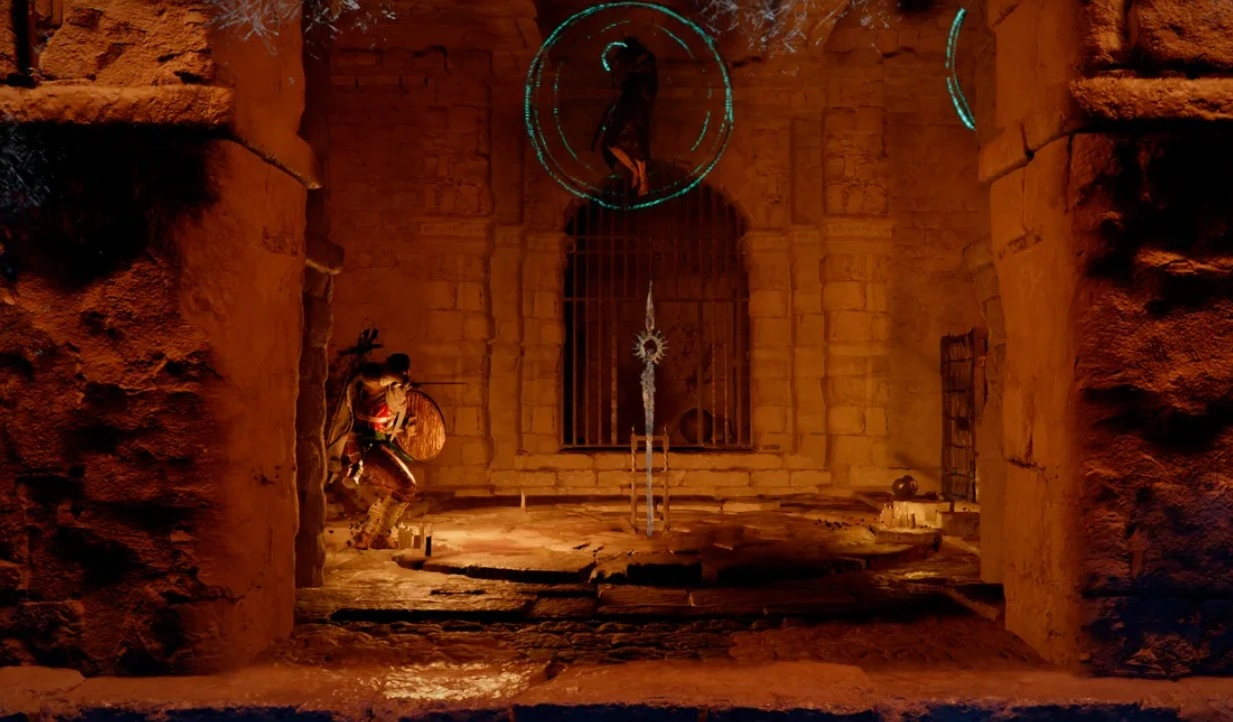 После приземления в комнату с копьем следует затаиться и дождаться, когда противники потеряют интерес к преследованию. Иногда в помещение могут залететь летающие колдуны. С ними придется расправиться с помощью быстрых ударов или выстрелов, после чего нужно снова дождаться момента спокойствия, чтобы появилась возможность вытащить оружие из земли.
