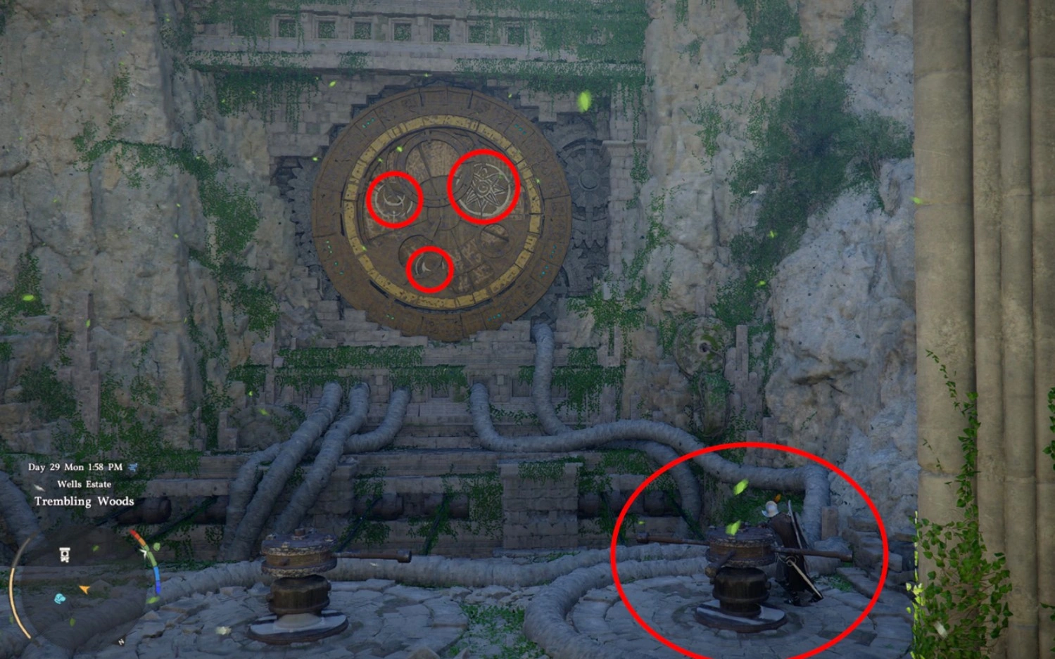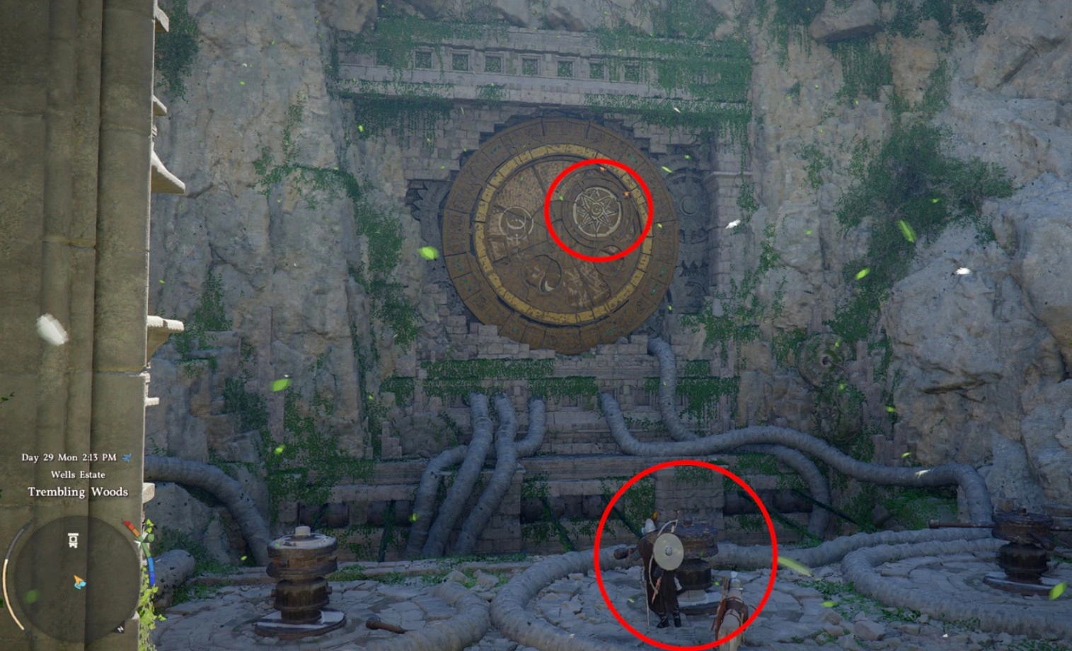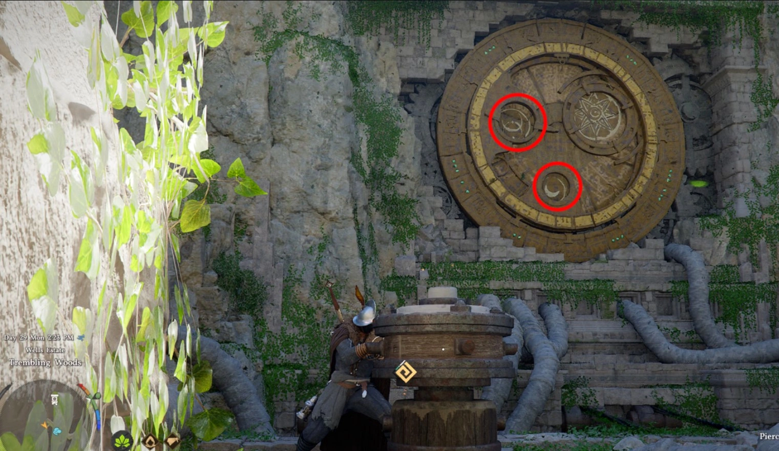- Левое колесо: несмотря на поломанные рукояти, используйте навык "Колющий удар", чтобы проткнуть колесо оружием. Вращайте два металлических круга до совпадения с двумя мелкими белыми изображениями.