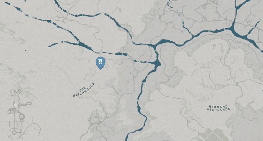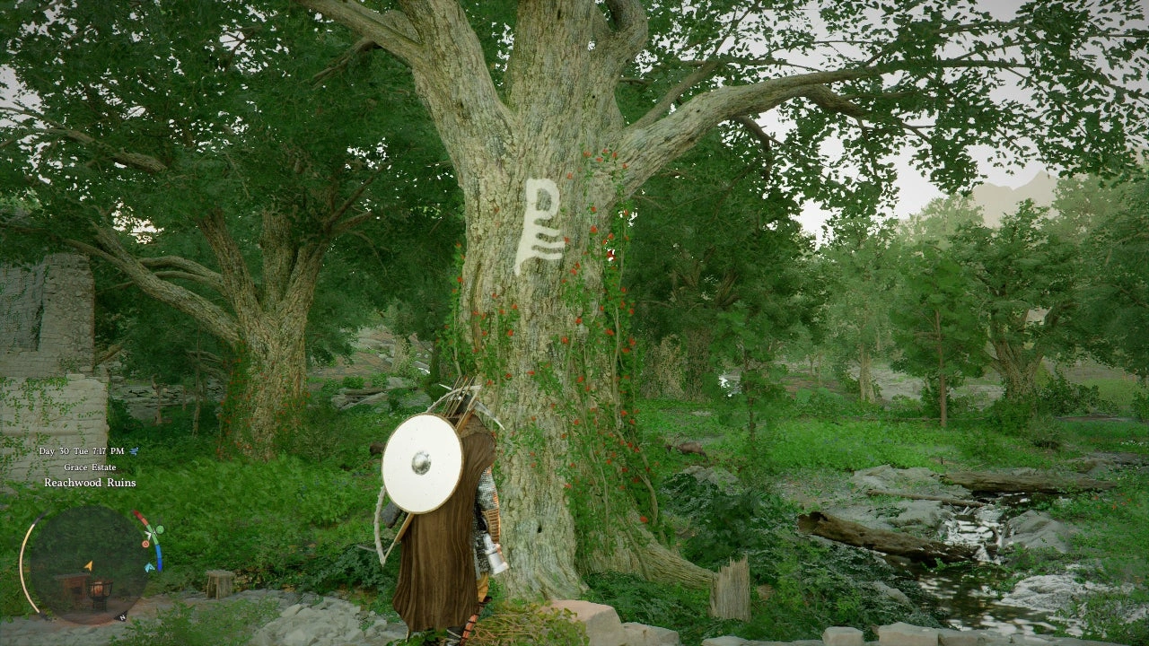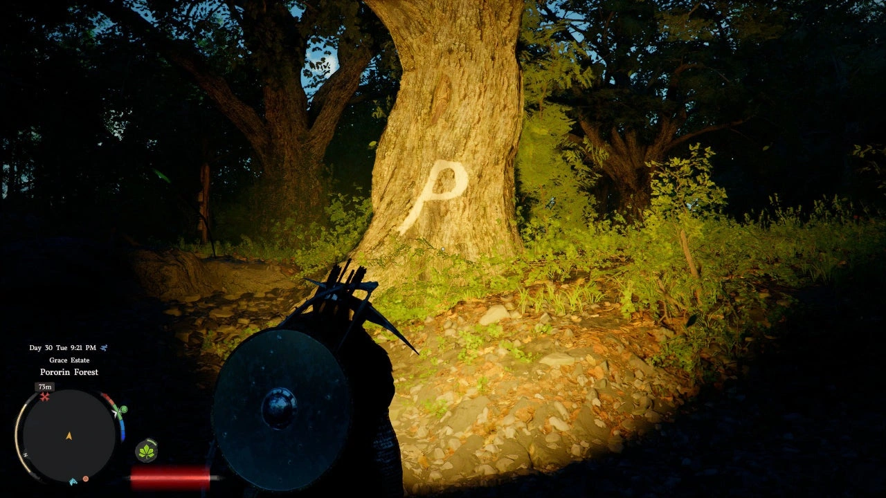 Дерево, где находится отметка, частично просматривается на карте, но выделено красным маркером. Его следует искать к югу от разрушенного Ричвуда, неподалеку от небольшого ручья, на юго-западной границе деревни Порорин. Сам знак представляет собой латинскую букву "P" с тремя дополнительными линиями, расположенными под верхней частью круга.