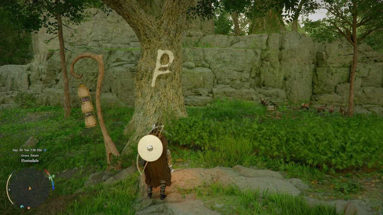 Ищите это дерево юго-восточнее основной части деревни, рядом с ульем и горшками, на небольшом возвышении. Символ напоминает латинскую F, но с боковой линией.