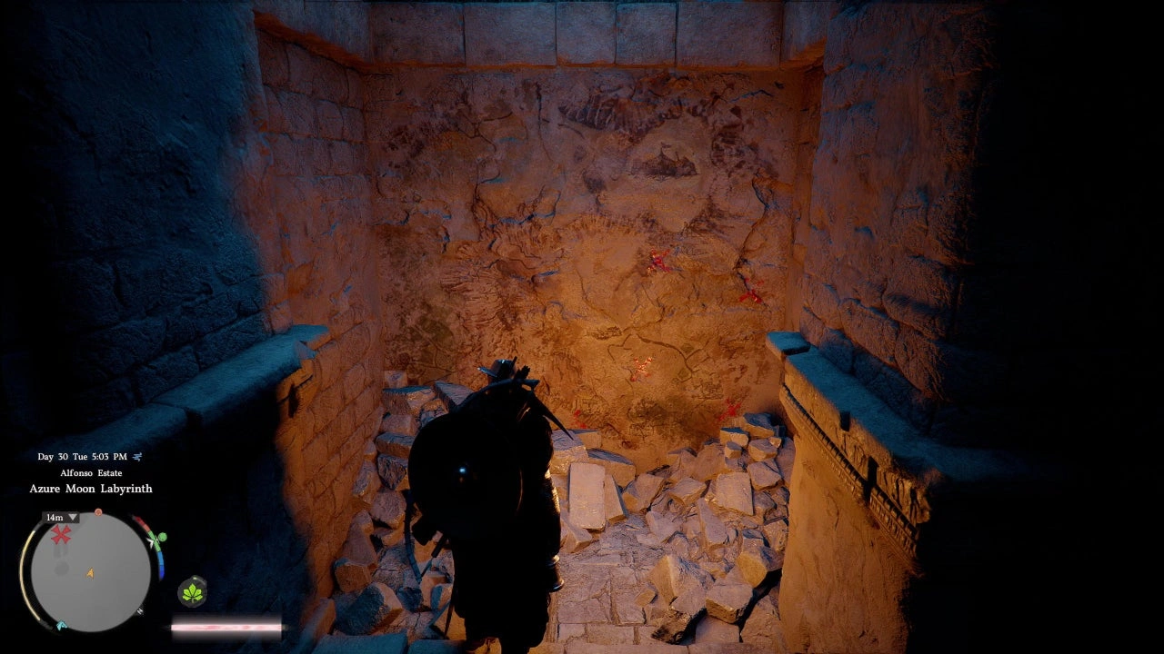 Похоже на ситуацию с руинами Каменной комнаты дракона, разгадку придётся искать, осматривая мир вокруг. Неподалёку от комнаты обнаружится стена с картой, которая укажет на места, где искать подсказки.