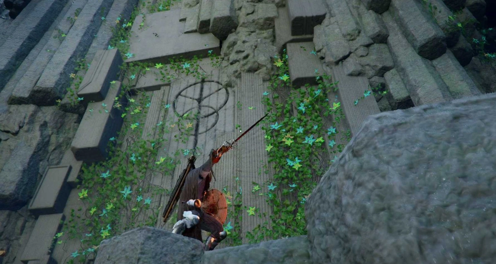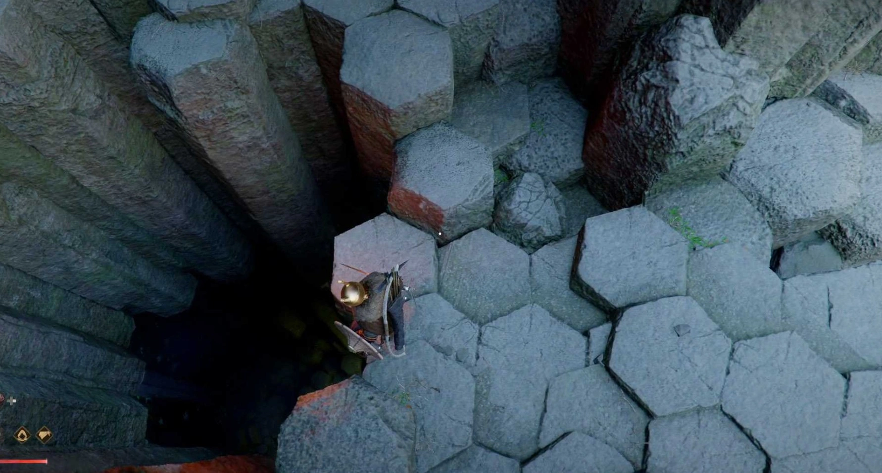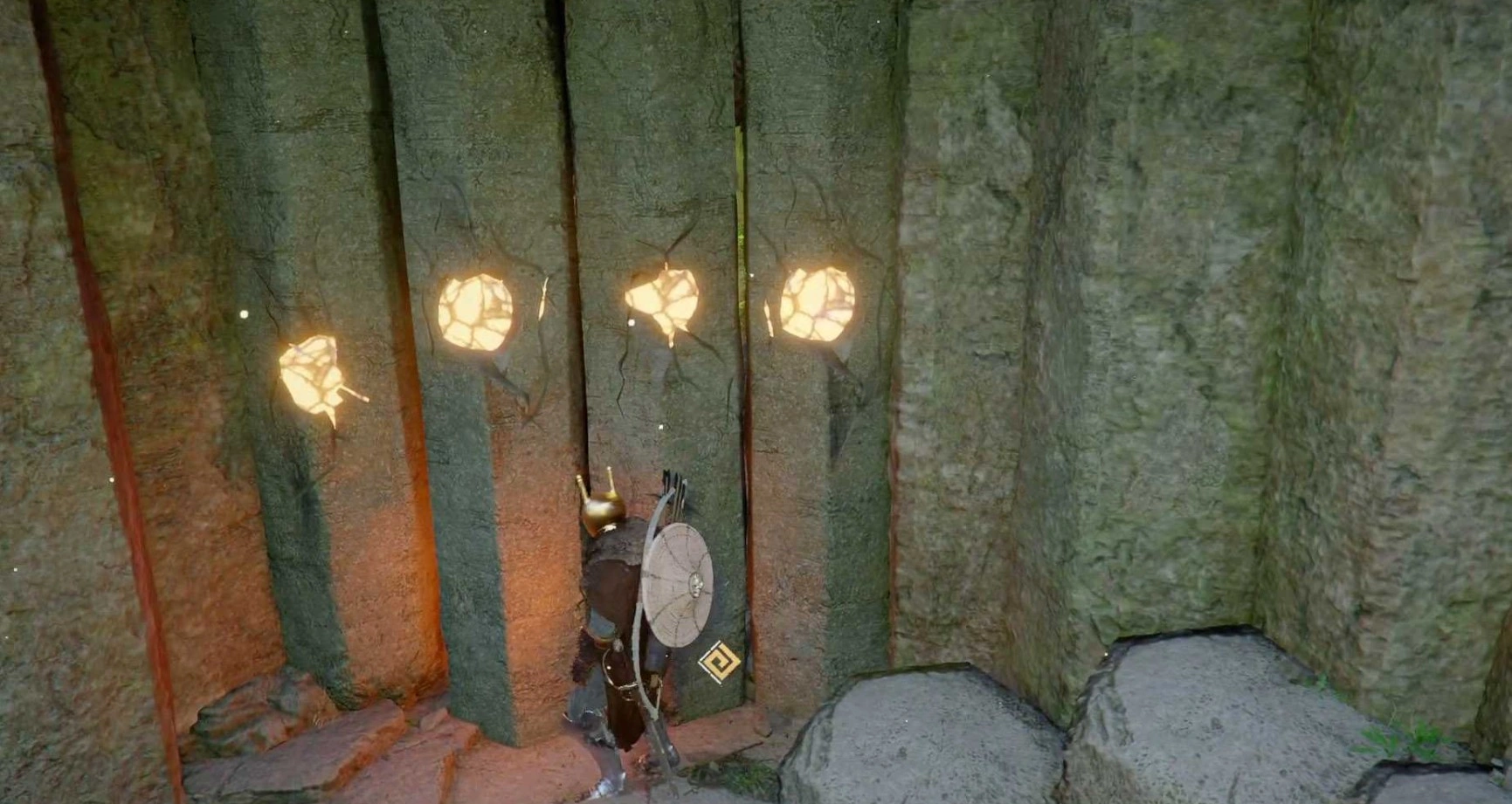 Ищите три скрытые ниши, заблокированные каменными блоками с рунами. Начнем с самой простой. Вам нужно будет опустить несколько колонн, чтобы проникнуть внутрь и забрать камень. Самый быстрый способ — обойти колонны, хотя есть и другие варианты. Эта ниша находится у подножия ущелья. Поднявшись наверх, над дверью из колонн, вы обнаружите отверстие, которое приведет вас к секретной нише. Светящаяся стена отодвинется, открыв доступ к камню.