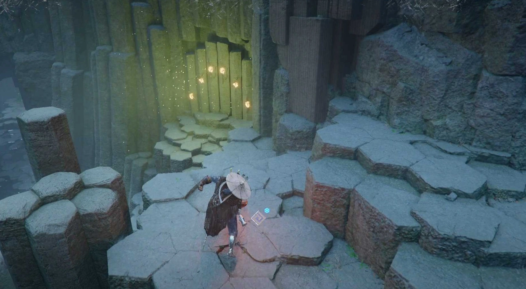 Эта последняя головоломка находится в русле реки, к югу от предыдущей локации, между двумя водопадами. Чтобы ее заметить, просто посмотрите вниз с предыдущего места. Проход состоит из трех колонн со светящимися рунами. Положение колонн меняется в зависимости от того, на какой камень вы направите свет. Для решения нужно выровнять их вершины. Правильная последовательность: средний, низкий, средний. Однако, есть простой трюк: направьте свет на левый камень, и все три колонны автоматически займут нужное положение.
