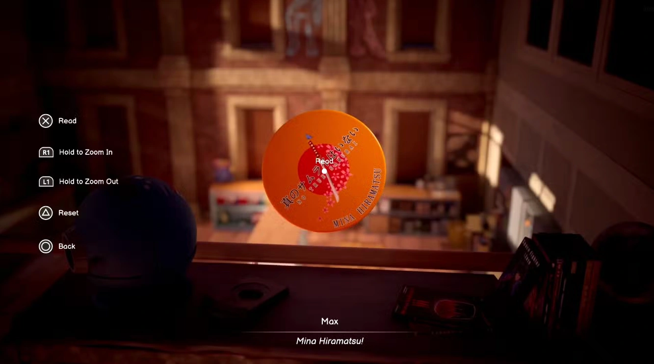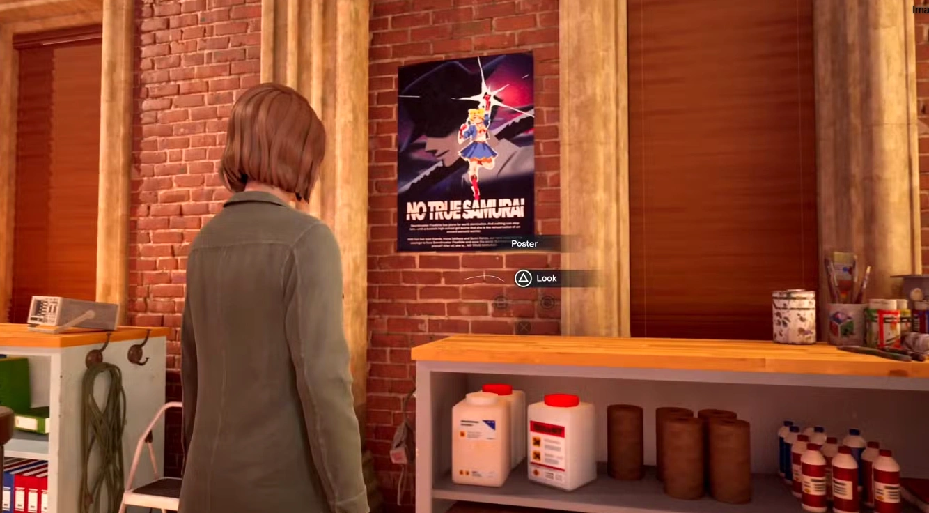 Упомянутый плакат находится справа в помещении (если смотреть лицом к лестнице). Он висит над полками с арт-материалами, слева от статуи самурая. Плакат указывает на то, что Мастера меча убила студентка, внешне напоминающая Сейлор Мун, но ее имя не раскрывается.