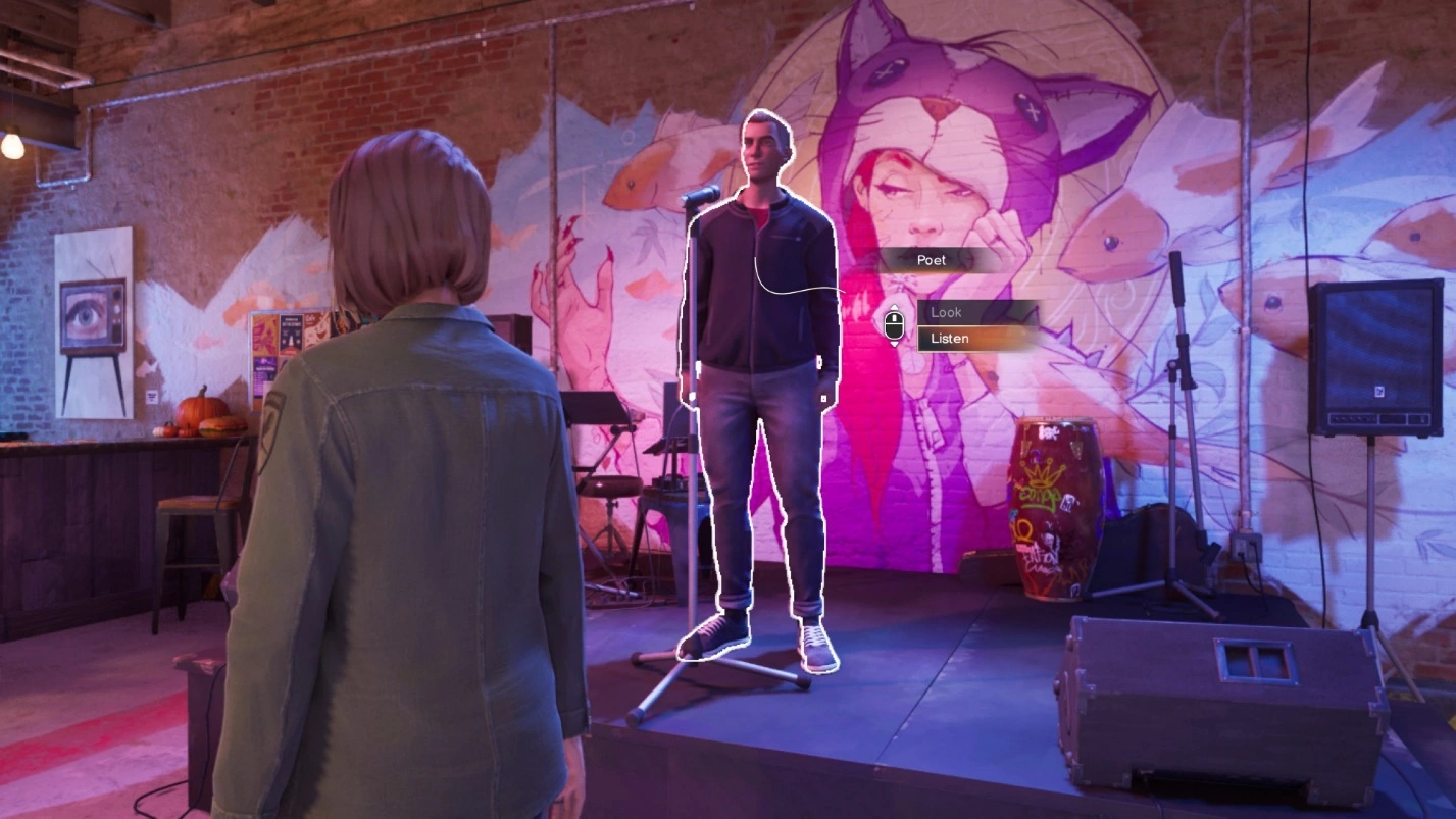 Суть: прослушать полный цикл поэтических выступлений на вечере, где поэты читают свои произведения. Как достичь: в самом начале главы «Микрофон открыт» вы увидите на сцене выступающего. Подойдите к нему и активируйте опцию «Слушать». Для получения награды повторите это действие ещё три раза, чтобы прослушать все запланированные стихи.