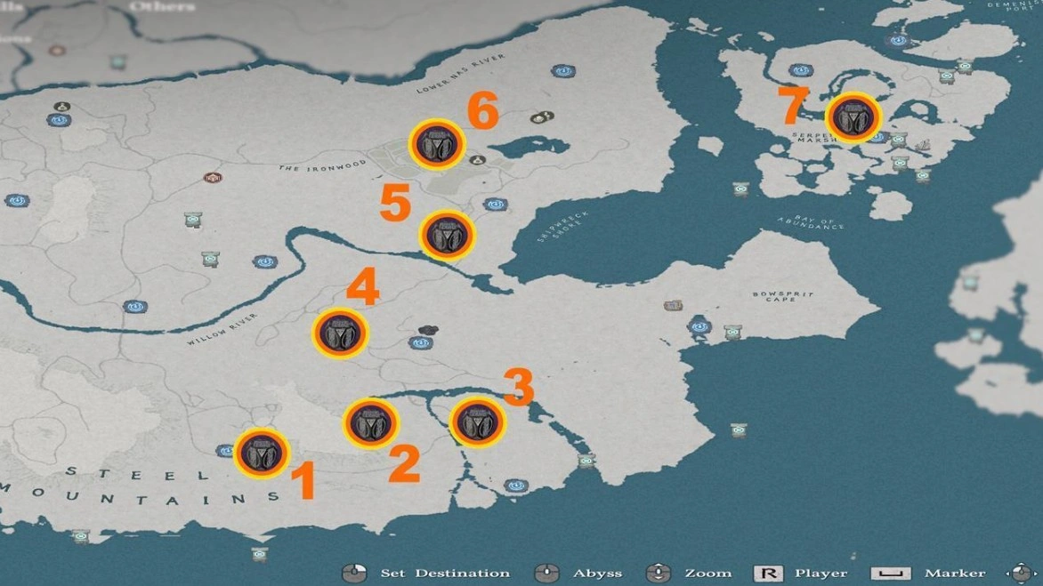 Южные просторы Деменисса полны секретов, и среди них — несколько запечатанных артефактов Бездны. Все их местоположения отмечены на скриншоте, который ты увидишь далее.