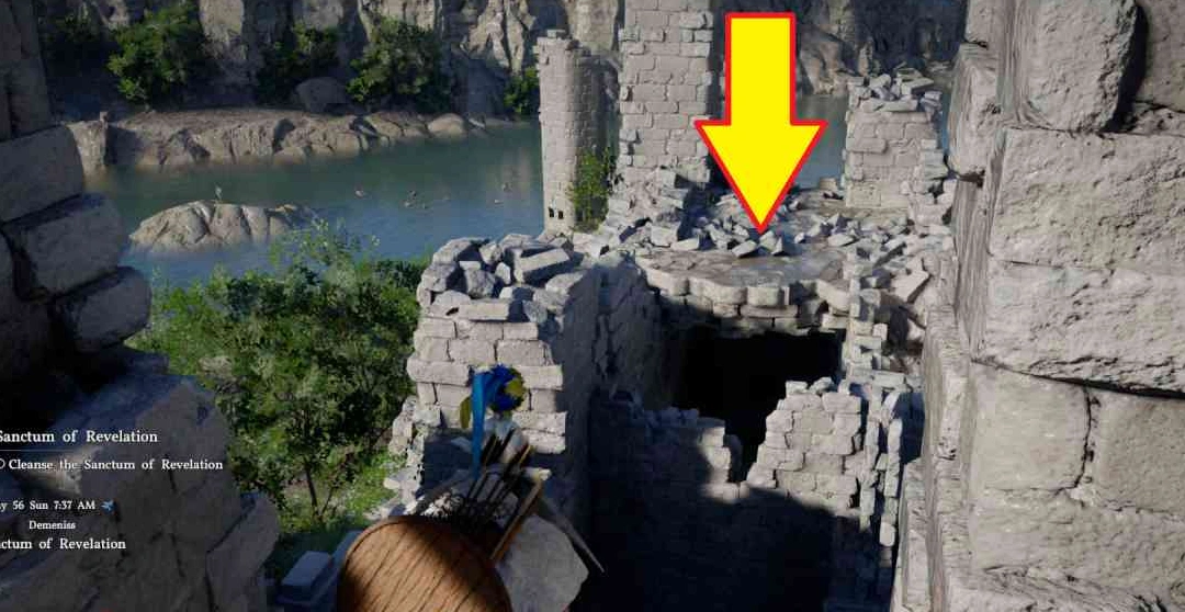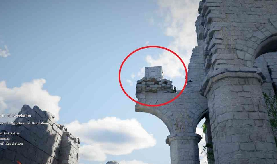 После освобождения вы окажетесь во дворе, где сражались с боссом. Двигайтесь на запад. Прямо за руинами вы заметите отдельно стоящее строение. Взобравшись на него, найдите трещину в крыше. Пробежав по ней, вы обрушите крышу и сможете спуститься внутрь, где обнаружите обломок колонны.