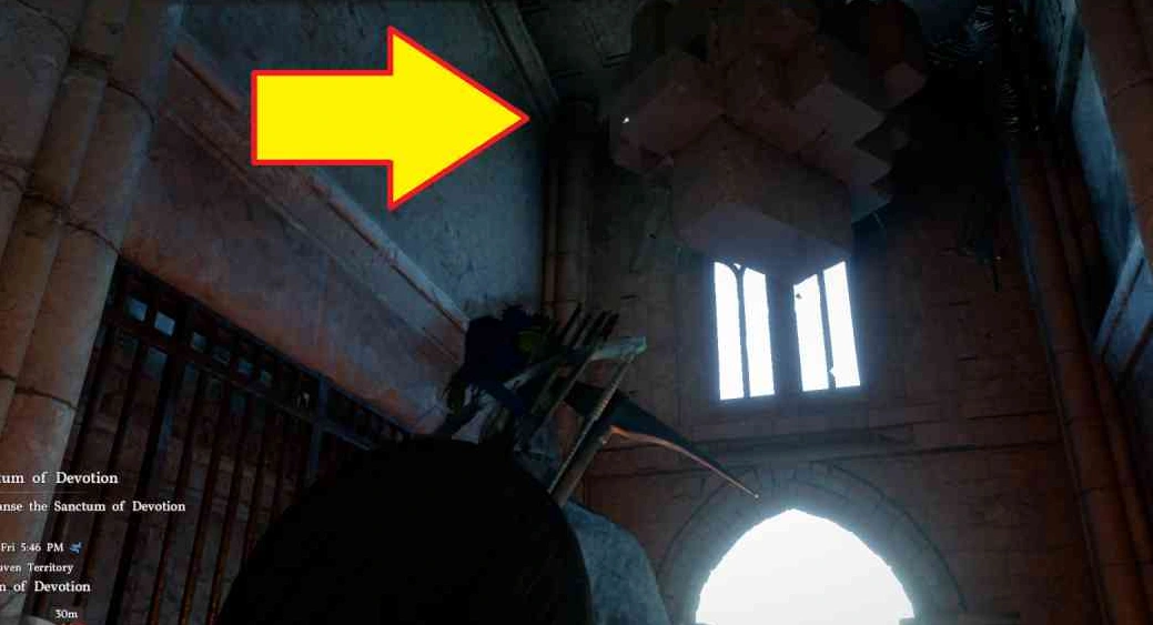 После освобождения святилища, займите позицию перед реактором на освещенной квадратной платформе. Поднимитесь по лестнице справа от основного блока, войдите в здание и пройдите до конца, затем развернитесь. Вы увидите парящий над дверным проемом фрагмент колонны. Используйте Силу Аксиомы, чтобы переместить его в котел Желтоклюва. Если у вас открыт навык «Пальмаровый удар: перенос» из зеленой ветки талантов, достаточно удерживать деталь в нужной позиции до появления зеленых листьев, а затем щелкнуть колесиком мыши. В ином случае, вам потребуется подпрыгнуть к парящей над колонной детали (если видите зеленую листву), подскочить и применить силовую ладонь в воздухе.