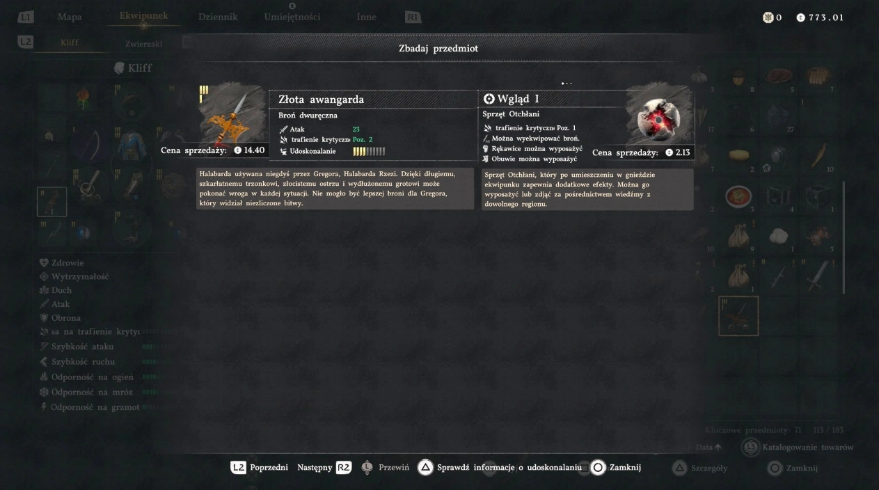 | Золотая алебарда «Золотой Авангард» | Основное оружие Грегора — двуручная алебарда с уникальными характеристиками и бонусами, как восстановление ресурсов при убийствах и повышенная критическая вероятность |