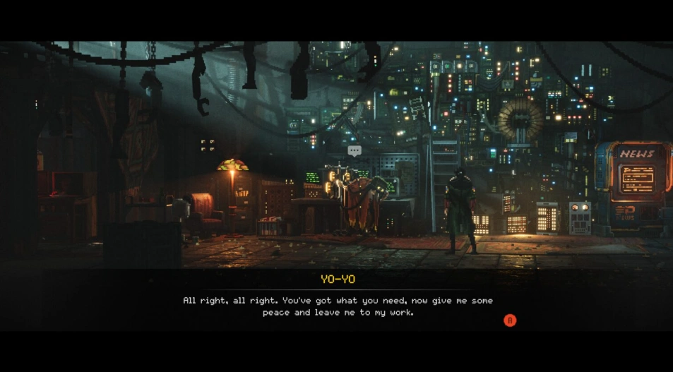 А теперь о документах. Справа от Йо-Йо вы заметите терминал с надписью «News». При взаимодействии с ним, для доступа к "подпольному форуму", выберите второй вариант.