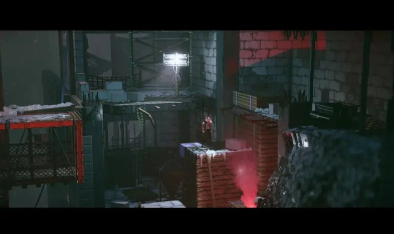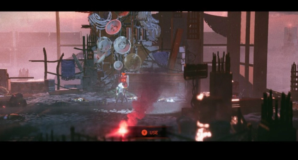 Вы снова окажетесь на улице, направляясь вверх по длинной лестнице. Правее есть уступ. Запрыгнув на него, поднимитесь на стопку досок. Двигайтесь вправо, перепрыгните через зияющее красным светом отверстие в стене. Там и спрятан коллекционный предмет.