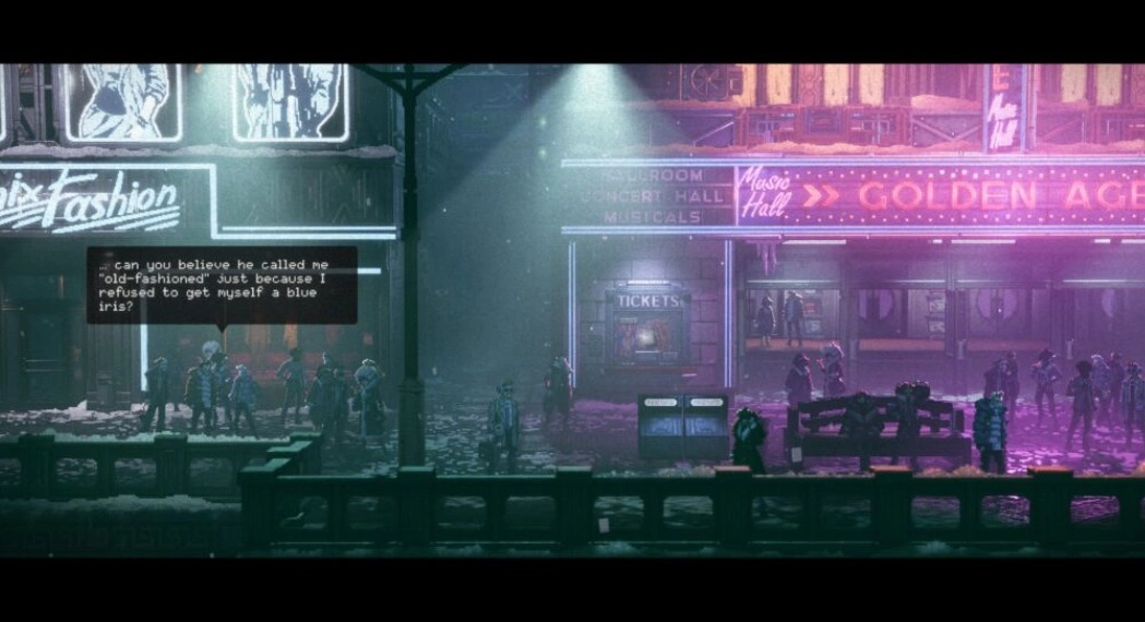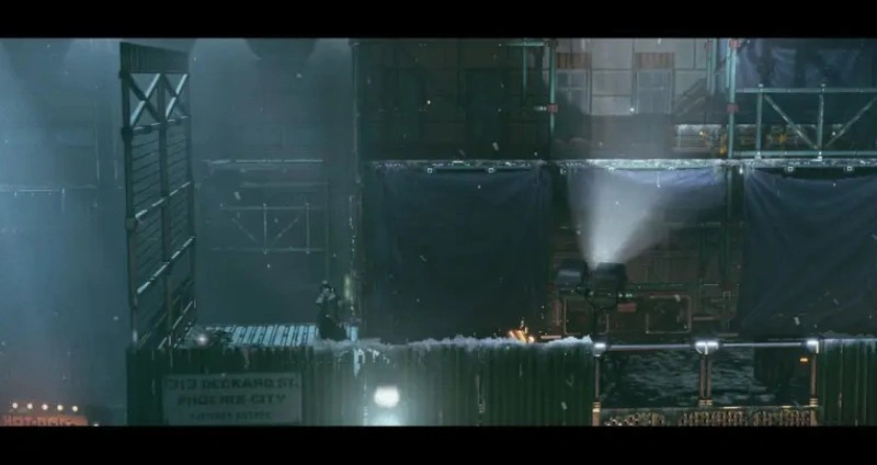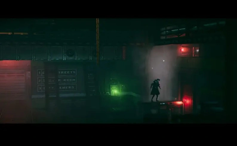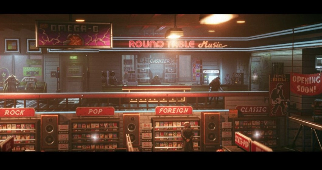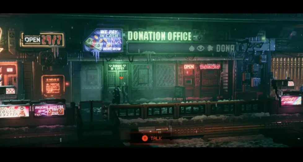 Спустившись на улицу и перейдя дорогу по пешеходному переходу, который сканируется дроном, вы попадёте на улицу с множеством магазинов. Двигайтесь направо, пока не увидите театр, освещённый фиолетовым светом. На доске объявлений слева от здания находится нужный предмет.