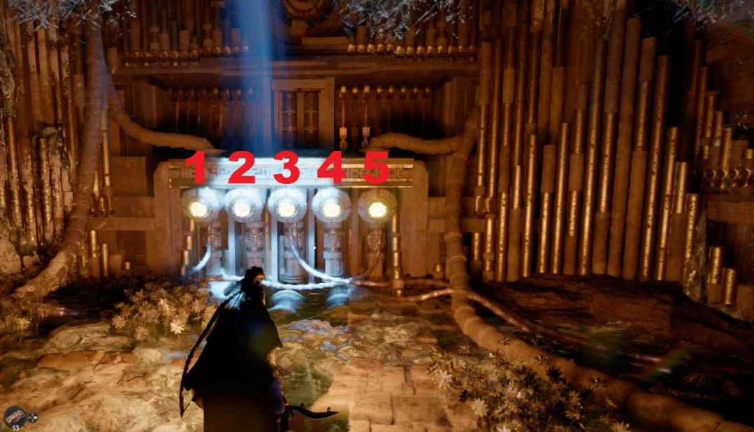 Ваша задача — использовать способность "Отражение света" (комбинация клавиш ЛКМ + CTRL, затем отпустить и снова зажать CTRL, не отпуская ЛКМ) на круглых кнопках. Таким образом, вам нужно будет воспроизвести услышанную последовательность нот. Пронумеровав кнопки слева направо от 1 до 5, нажимайте их в следующем порядке: 5 – 1 – 2 – 3 – 4 – 5 – 1 – 1. Если всё сделаете верно, кнопки загорятся синим, и шестерёнки слева заработают.