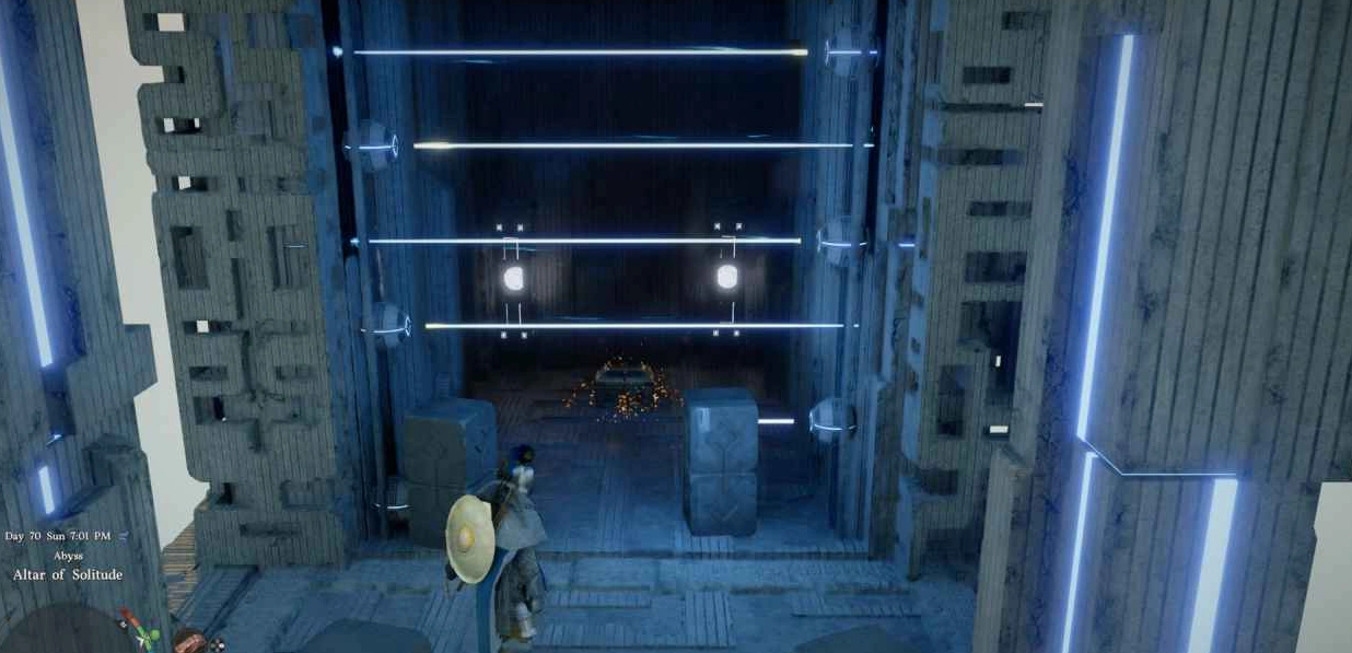 Путь от "Алтаря одиночества" к "Ледяной колыбели" пролегает через серию платформенных прыжков. Если присмотреться вниз и вправо от точки активации Небесных врат, можно заметить лазеры за дверью, ведущей к сундуку.