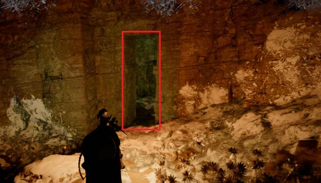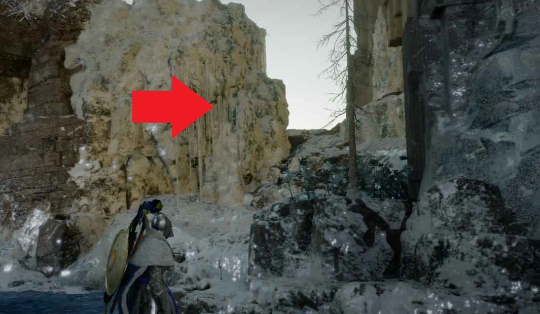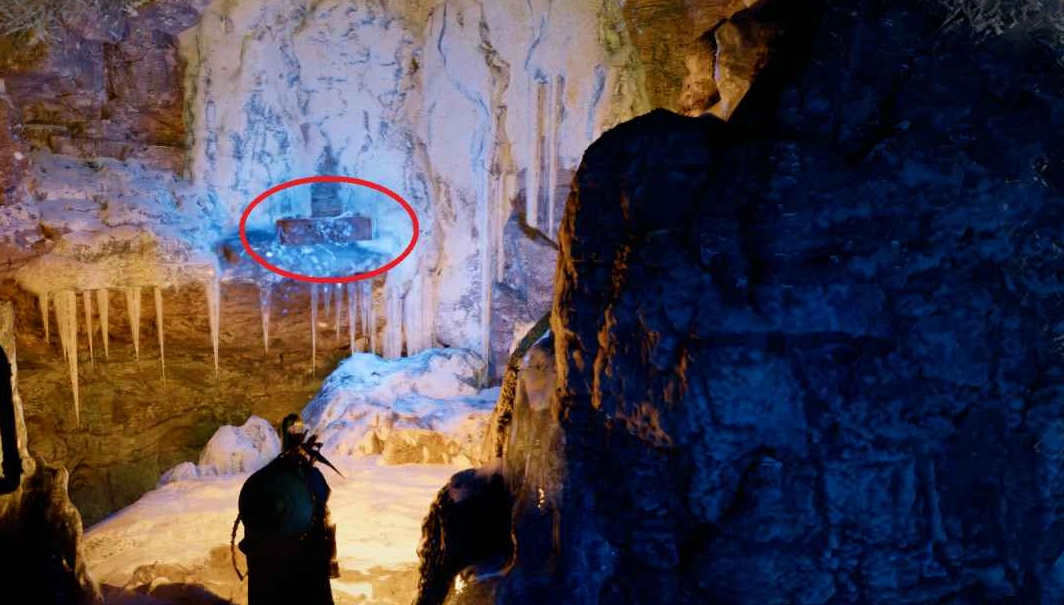Вернитесь в предыдущую комнату и посмотрите на отверстие в потолке. Подпрыгните и примените тройной удар силовой ладонью, чтобы набрать высоту, а затем спланируйте на крыльях к камням справа. Заберитесь в верхнее помещение. Попытка взобраться по ледяной части слева приведёт к соскальзыванию.