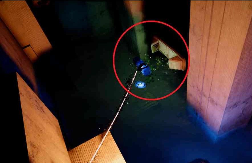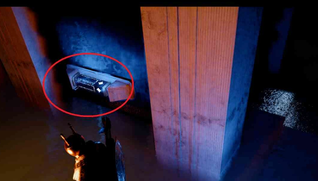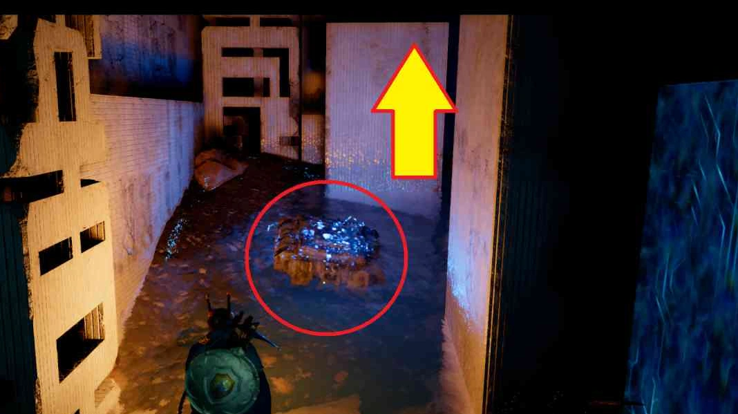 Прибыв на реку Денн, оглянитесь: в воде вы увидите светящийся блок. Запрыгните за него на уступ, где обнаружите цилиндрический стержень. Подтяните его "Силовой ладонью" и оставьте над отверстием в каменном сооружении. Вернитесь к телепорту, возьмите синий блок и вставьте его в слот в полу, ориентируясь на зеленые листья. Подпрыгнув над блоком, используйте "Силовую ладонь", чтобы зафиксировать его.