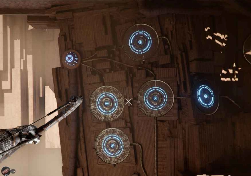 В подземном переходе обратите внимание на стену справа. Вам нужно будет выровнять три круглые пластины так, чтобы по ним шел электрический ток. Для этого воспользуйтесь способностью "Отражение света" (CTRL + ЛКМ), чтобы увидеть синюю линию. Следуйте по этой линии, она приведет вас к стене с кнопками. Цель — сделать все кнопки синими, используя "Силовую ладонь". Электричество должно пройти через каждую кнопку.